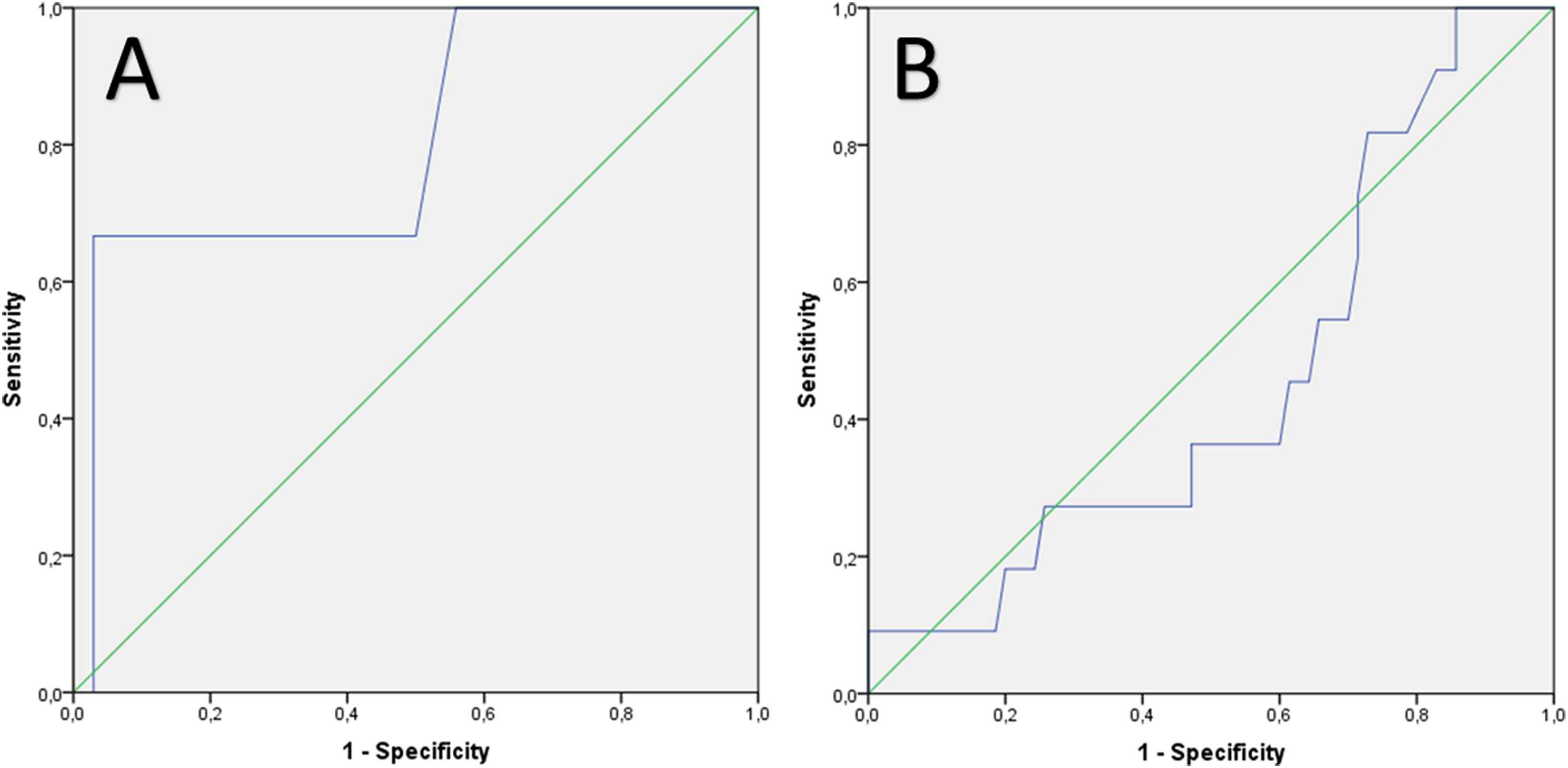 ROC analysis for prediction of pending interventional coronary artery treatment using systolic peak blood pressure during exercise testing in (A) females (AUC 0.80) and (B) males (AUC 0.46).