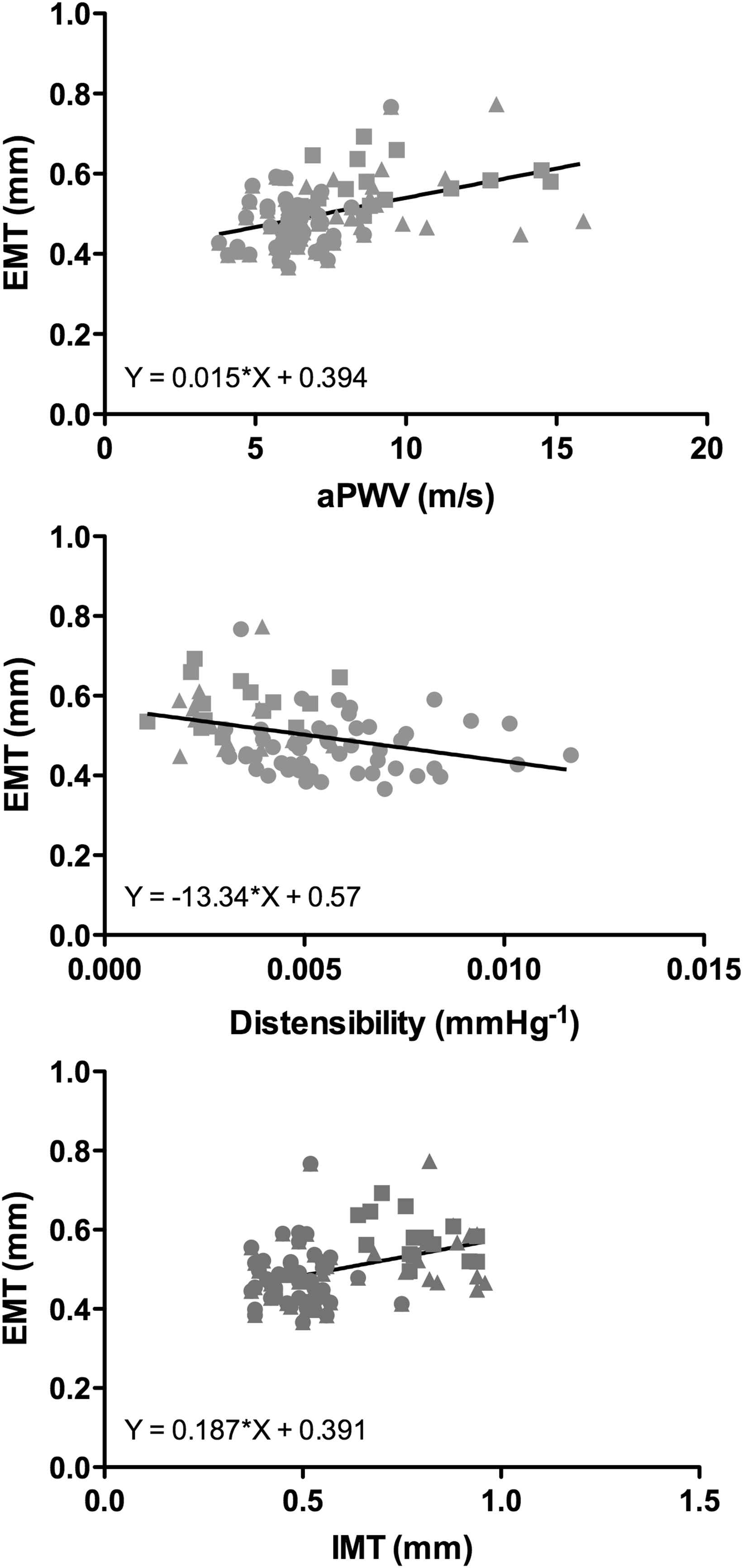 Correlation analyses were conducted to determine the relationship between EMT, measures of arterial health and other known cardiovascular disease risk factors. EMT was significantly correlated with age (ρ = 0.48, P < 0.01), aPWV (r = 0.46, P < 0.01), IMT (ρ = 0.41, P < 0.01), and distensibility (r = −0.37, P < 0.01) (Table 2). Figure 1 demonstrates the linear relationship between EMT and measures of vascular health.