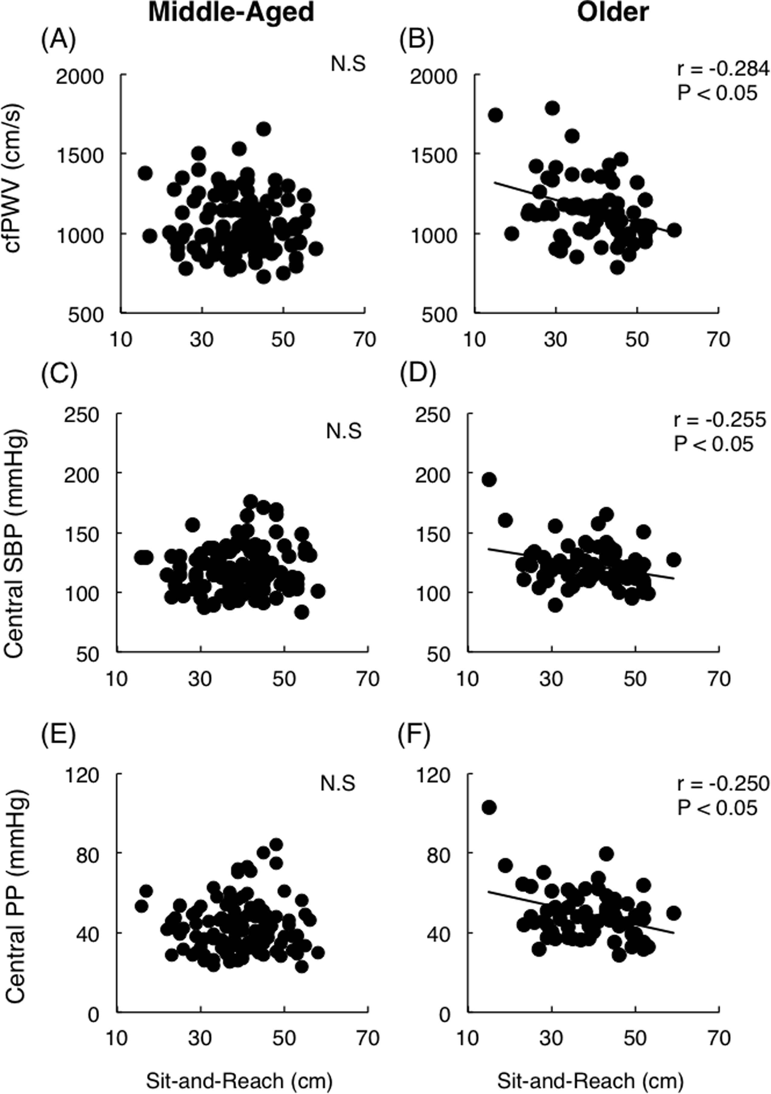 The relationship between sit-and-reach flexibility and carotid-femoral pulse wave velocity in middle-aged (A) and older (B) individuals, between sit-and-reach flexibility and central systolic blood pressure in middle-aged (C) and older (D) individuals, and between sit-and-reach flexibility and central pulse pressure in middle-aged (E) and older (F) individuals. cfPWV, carotid-femoral pulse wave velocity; SBP, systolic blood pressure; PP, pulse pressure.