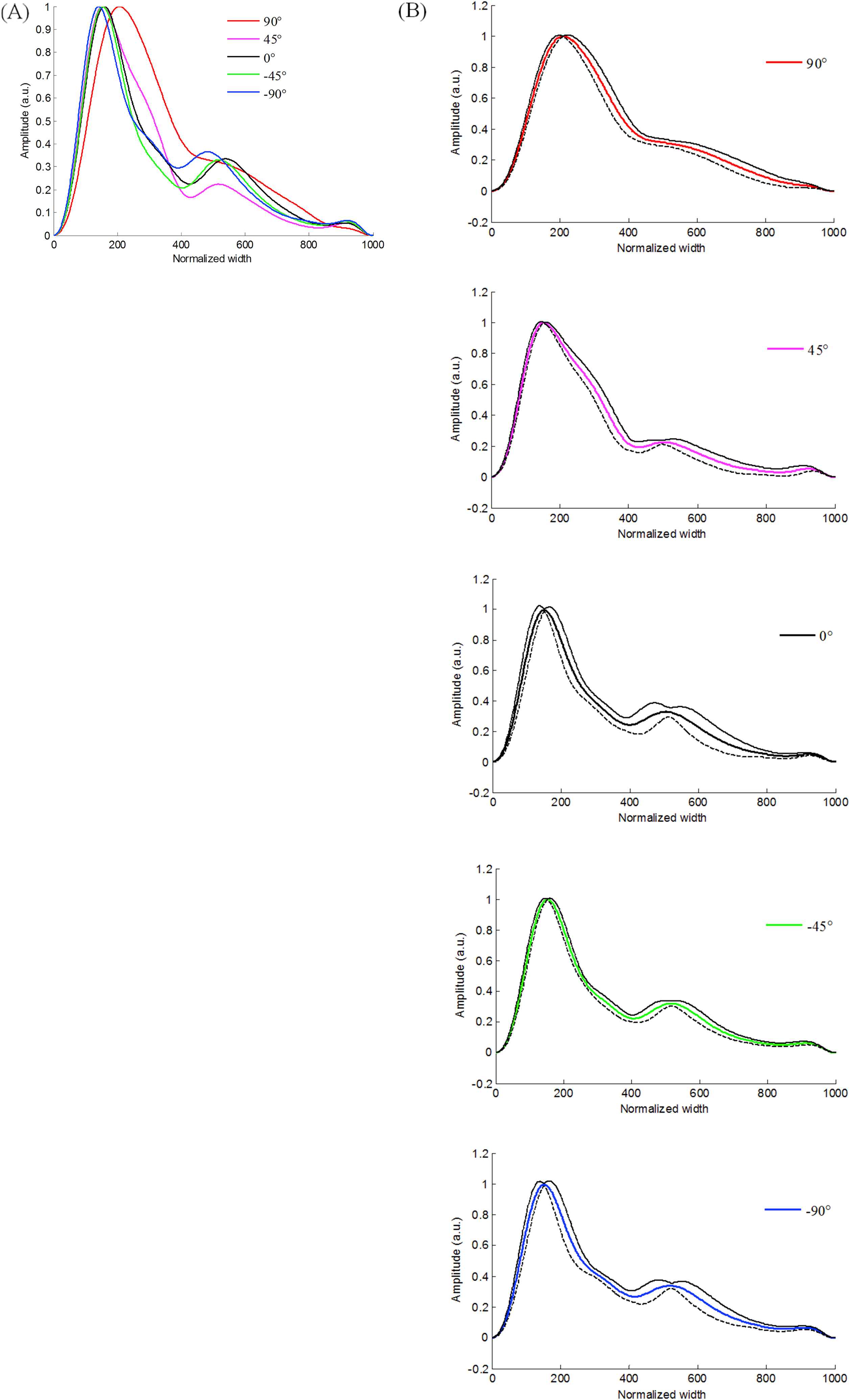 For each recording, the feet of the recorded radial artery pulses were detected by an open-source algorithm21,22 and then manually verified. 11 consecutive stable and high quality beats were chosen by manual. Then 11 separate beats were extracted respectively between two adjacent pulse feet. In order to eliminate the effects of changes in applanation pressure, the pulse waveform is normalized. Each beat was then normalized with the length of 1000 points and amplitude of 1 (i.e., pulse foot had amplitude of 0 and pulse peak of 1). Normalized mean pulse template (NMPT) was then constructed by averaging 11 normalized pulses from each recording. Figure 2 shows the examples of five NMPTs with the left arm at 90°, 45°, 0°, −45° to −90° to the horizontal level. For each subject, a total of 40 NMPTs are obtained, with 20 NMPTs from the moving arm (left or right) at the five different positions (2 repeat sessions, 2 moving arms, 5 positions), as well as 20 NMPTs from the reference arm.