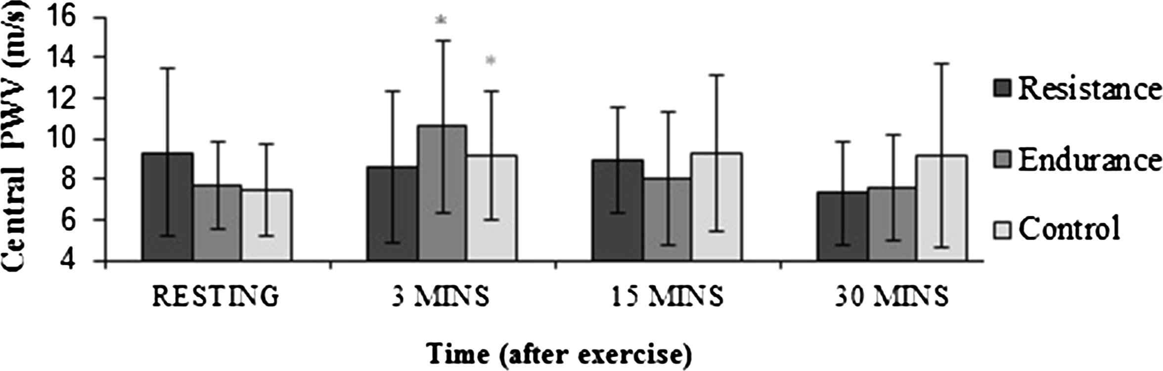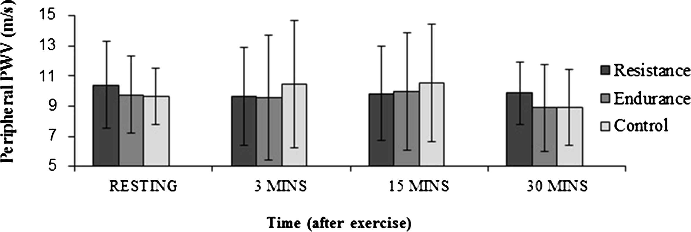 Results: Resting PWV did not differ significantly between groups. In the endurance and control group, central PWV increased at 3 min post-exercise (from 7.7 ± 2.2 to 10.6 ± 4.2 m/s; P = 0.02 and from 7.4 ± 2.2 to 9.1 ± 3.1 m/s; P = 0.01 respectively), followed by a decline to baseline within 15 min of exercise cessation. Central PWV fell at 30 min post-exercise (P = 0.08) in the resistance group, although this was a non-significant reduction. Peripheral PWV did not change significantly from respective baseline values in any group.