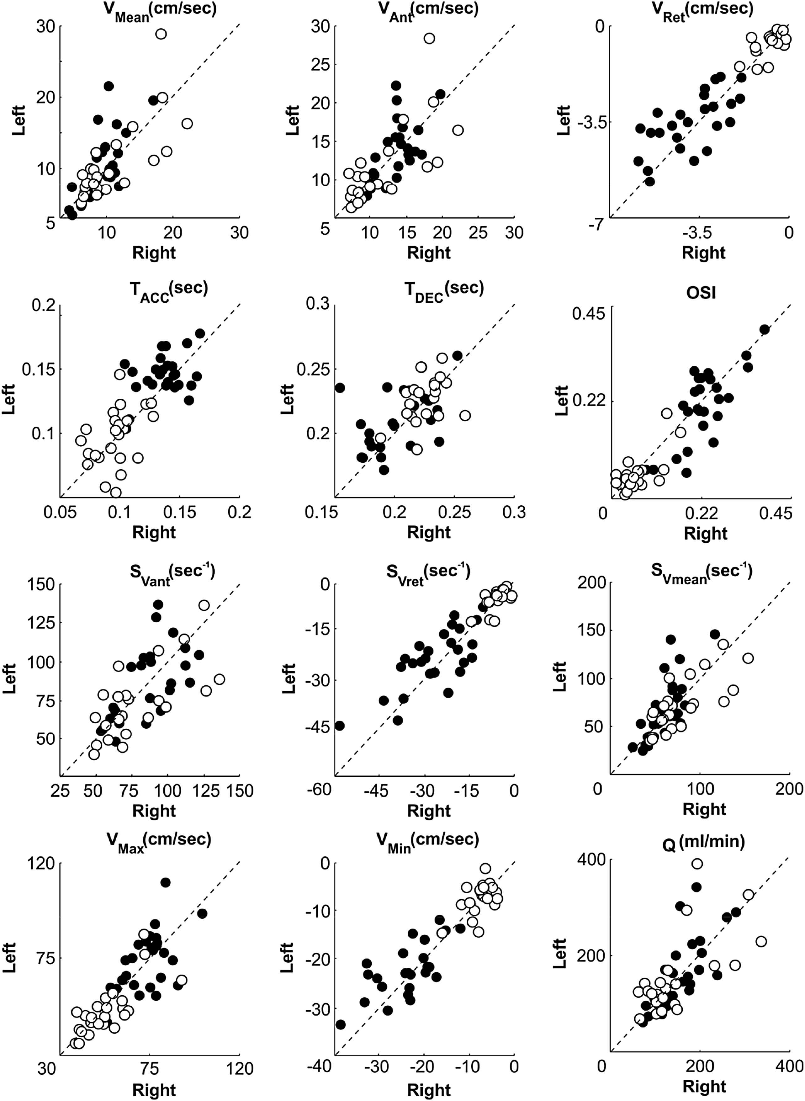 Scatter graph illustrates subjects (n = 25) individual mean values of haemodynamic parameters (see Table 2) obtained from superficial (black circle) and deep (white circle) femoral arteries on both sides. Dotted line indicates entire bilateral symmetry, deviation from line- increasing degree of asymmetry.