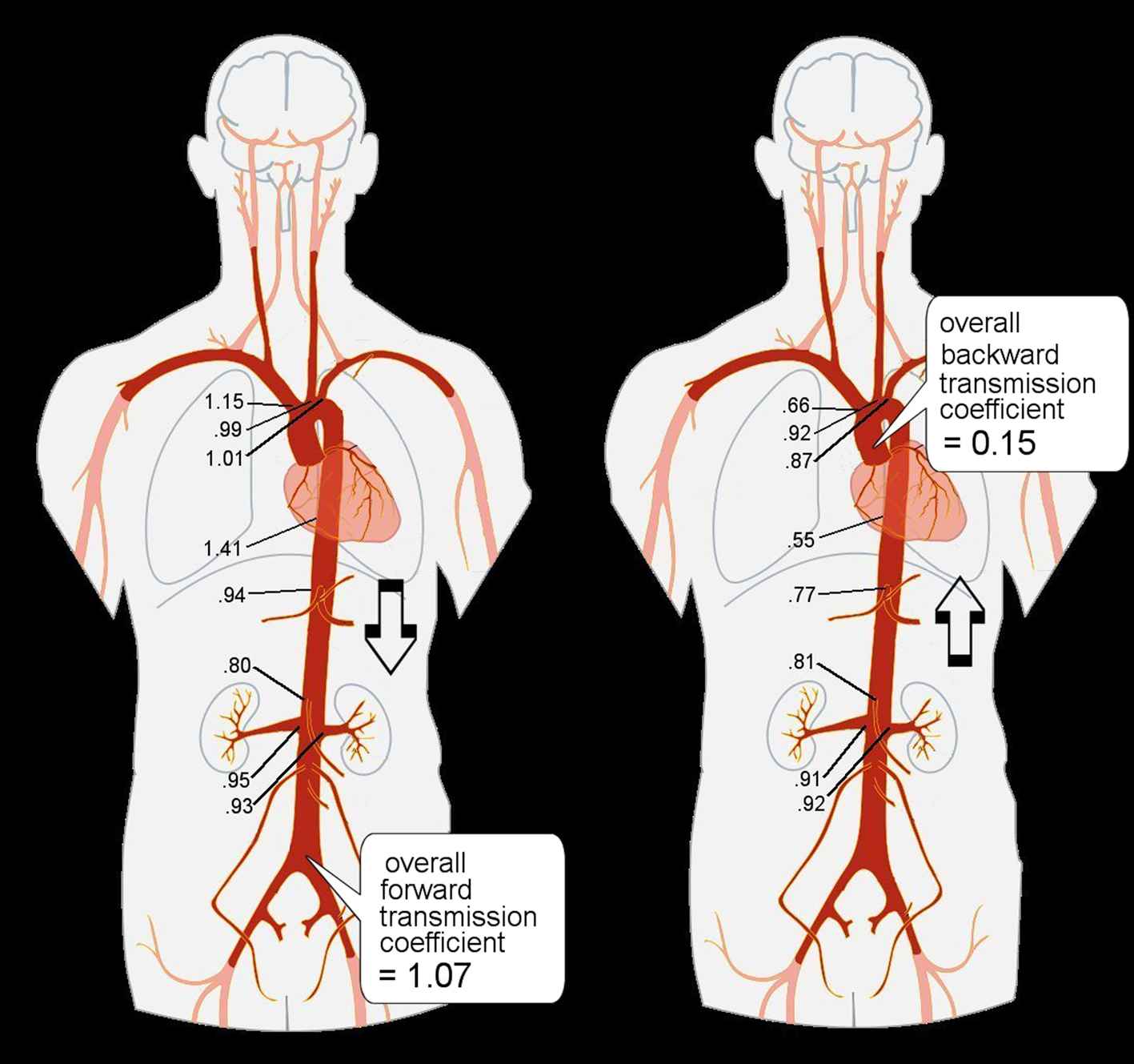 It has been observed by many that the anatomical and mechanical properties of the large arteries are such that they are approximately ‘well-matched’ for forward travelling waves.15 That is to say Γa ≈ 0 when a is the parent vessel. It follows, however, that a bifurcation which is well-matched in the forward direction cannot be well-matched in the backward direction which means that much of the energy of a wave approaching a bifurcation in one of the daughter vessels will not propagate into the parent vessel. For example, a symmetrical bifurcation that is well-matched in the forward direction Γa = 0 will have a reflection coefficient Γb = −0.5 for a backward travelling wave in vessel b. The effect of this asymmetric propagation of waves in the human aorta is shown in Fig. 11. The figure shows the transmission coefficients for forward waves (left) and backward waves (right) calculated for the major bifurcations in the aorta using data published in Refs. 31,23 The net gain for forward waves, 1.07, indicates that the aorta is very close to well-matched in the forward direction. The net gain for backward waves, 0.15, indicates how poorly backward waves are transmitted as the travel up the aorta. This, I believe, is the explanation for the observations of Westerhof et al. in their 1970 experiment (Fig. 4).