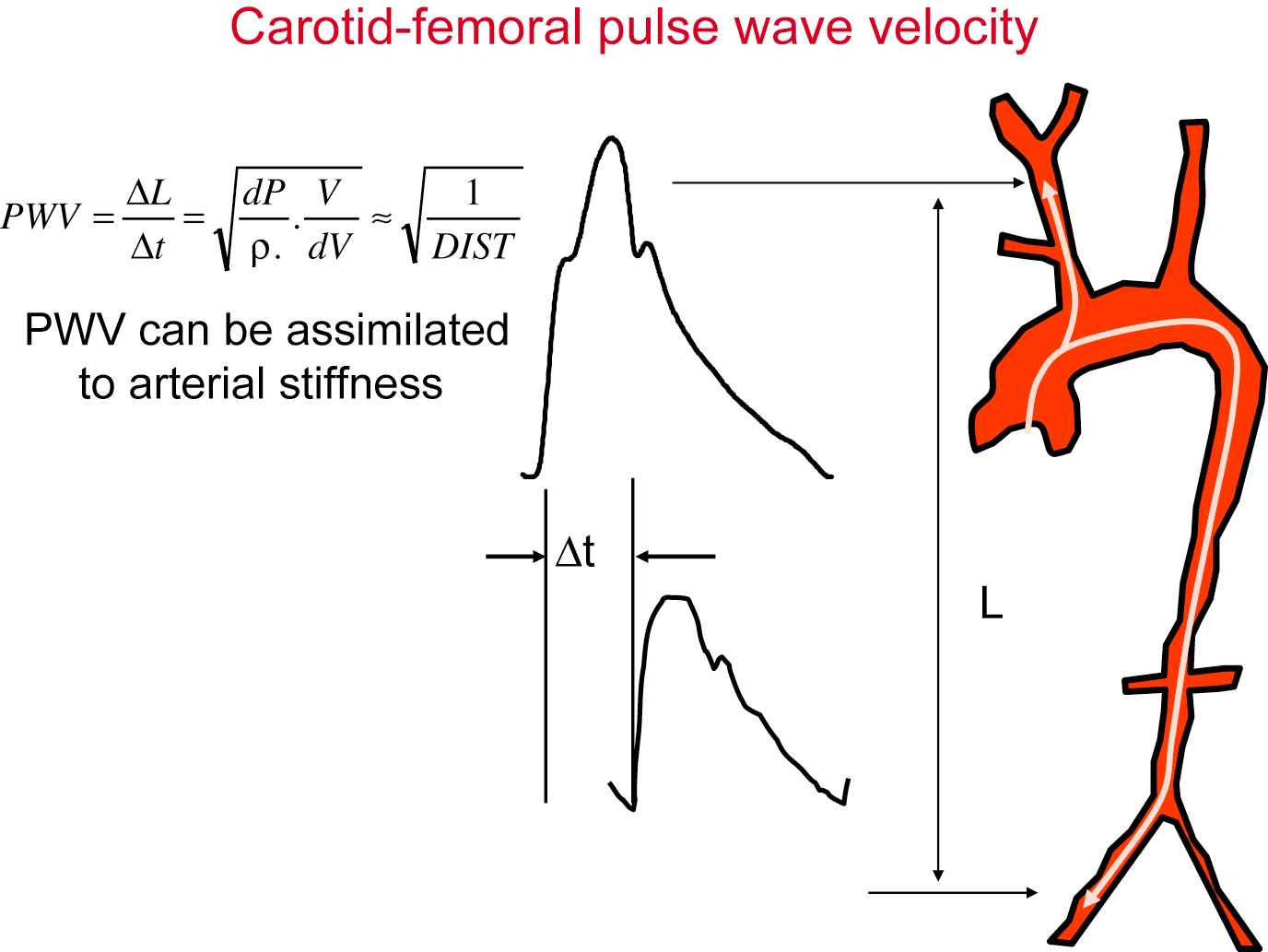 Measurement of pulse wave velocity is the simplest way to assess arterial stiffness. Arterial stiffness is a key factor in cardiovascular physiology. It represents the ability of the arterial system to cope with the systolic ejection volume. It also implies that the compliant arterial system’s major function is to relay cardiac contraction during diastole. Indeed, cardiac contraction lasts only 1/3rd of the time. Due to the distension of the compliant large arteries during systole, after the end of cardiac contraction, the large arteries return to their initial dimension and help in blood flow.1,2 This phenomenon is of key physiological importance as diastolic flow in arteries may represent more than half of cardiac output. Large artery stiffness represents the dynamic force opposing ejection (also called impedance), if low, it helps in ejection, the higher the stiffness, the less efficient the diastolic facilitation of ejection. Many methods have been proposed to quantify this phenomenon. The simplest is to calculate the ratio between central pulse pressure and systolic ejection volume. This is easily done during cardiac catheterization, and this technique has been validated in term of cardiovascular events3; however, this is not practical in routine. The three techniques that are mostly used are (a) pulse transit time measurement, (b) analysis of the arterial pressure pulse and its wave contour, and (c) direct stiffness estimation using measurements of diameter and distending pressure.4