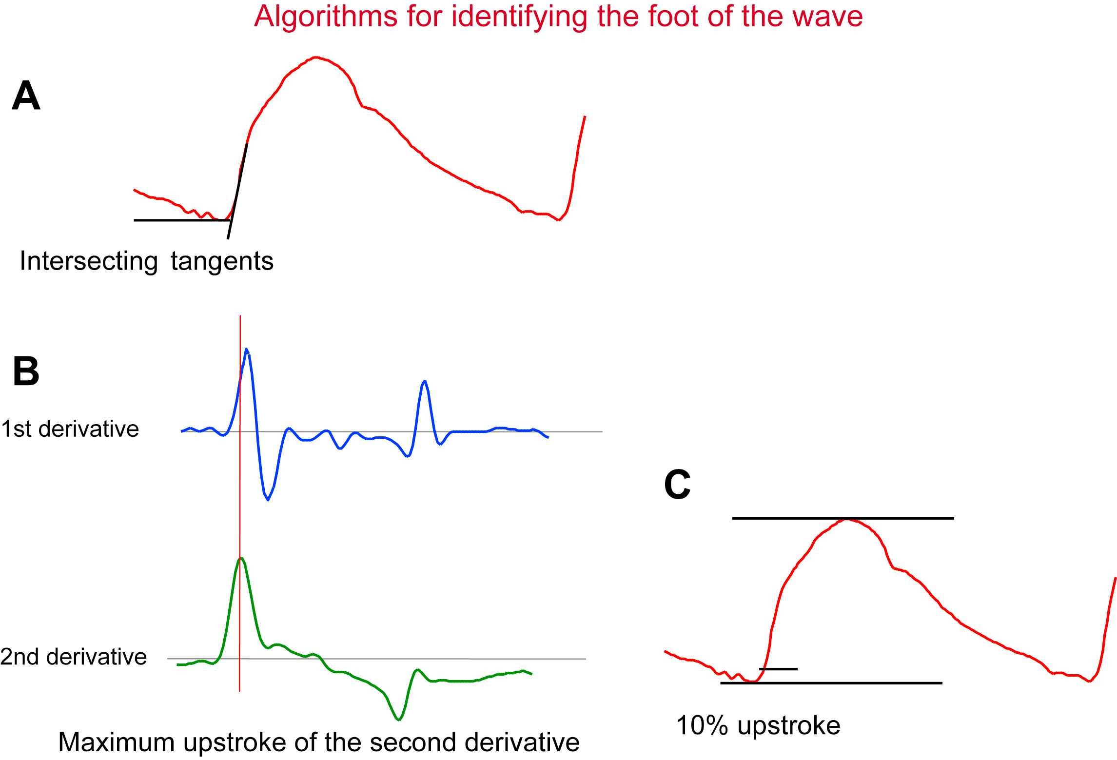 Different algorithms used to identify specific part of the pulse signal (here distension waveform of the carotid artery). Panel A: intersecting tangents; Panel B: maximum upstroke of the second derivative; Panel C: percentage of the full amplitude of the cycle.