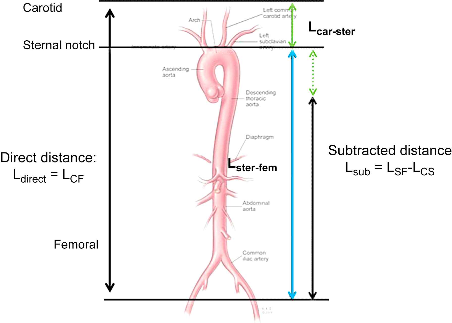 Pulse wave velocity could be measured on any vessel. The theory underlying the relationship between PWV and stiffness implies an homogeneous, isotropic material, with no curvature, which is obviously not the case for arteries. The preferred site for the proximal measurement is the common carotid artery, and the femoral artery for the distal site. The problem arises when arterial pulse moves in opposite ways. This is not a major problem as long as the stiffness of the common carotid artery (and the brachiocephalic trunk) is identical to that of the thoracic aorta, which is close in reality. It is a problem also for pathway measurement. Different ways to measure distance are represented in Fig. 3. The simplest way to measure pathway is to measure transcutaneously using a tape meter or a caliper. If the measurement is made between the two measurement sites, it leads to a systematic overestimation of PWV by an amount close to 30%. It is possible to correct this by subtracting the distance between the carotid site and the sternal notch from the overall distance. This method provides values closer to invasive measurements, but is more complicated, and is a source of errors. Moreover, the direct (carotid to femoral) distance was used in nearly all epidemiological studies.4 A European project conducted by a consortium of expert centers will provide reference values for arterial stiffness, together with conversion factors for converting measures obtained with one method to the other.25 The measurement of aortic pulse wave velocity using Doppler probes positioned at the suprasternal notch and close to the umbilicus bypasses such difficulties,7,26 because it measures a more homogeneous vessel with no bifurcation. This advantage is tempered by more imprecision on the precise site of flow signal acquisition.