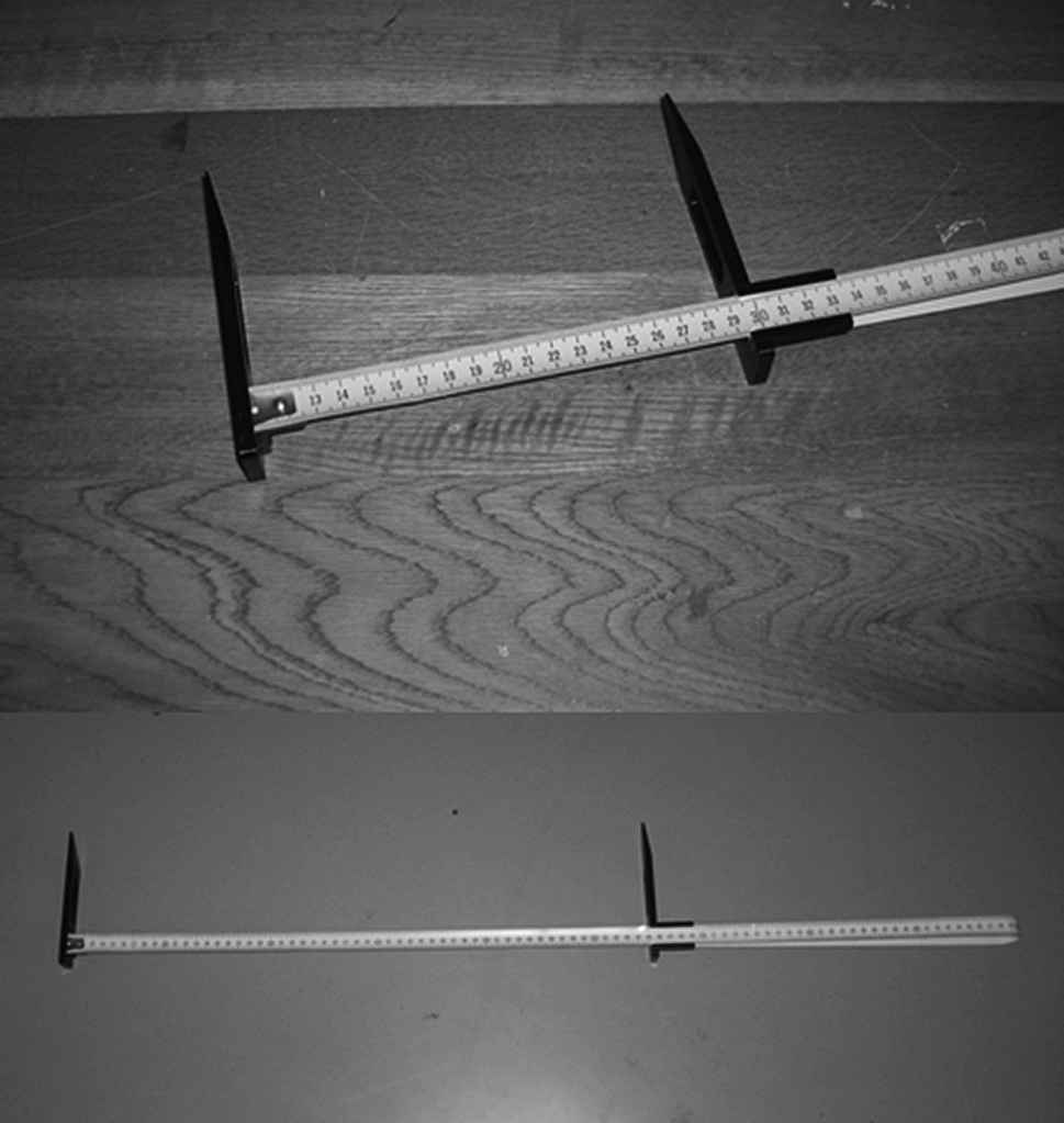 A customized segmometer (top: slider indicators; bottom: entire image). Segmometer consists of a flexible metal tape like a retractable carpenter’s tape and two slider indicators.