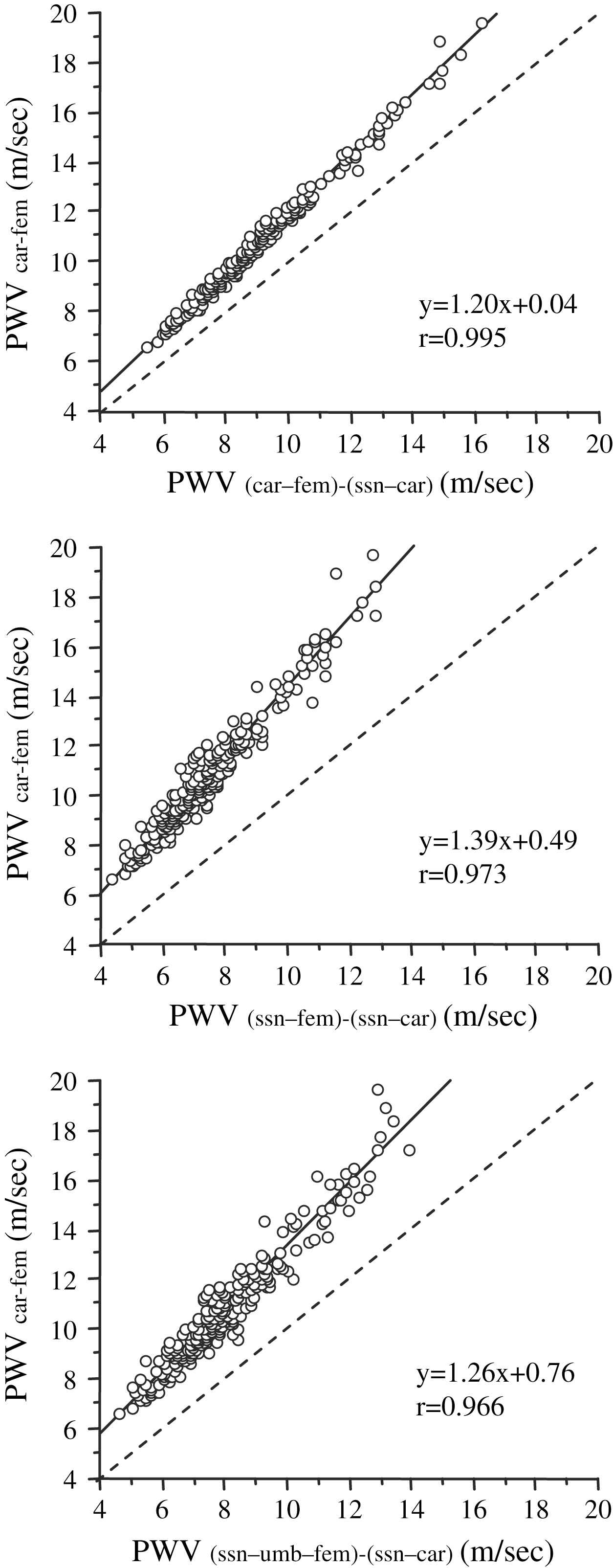 Results: All the calculated PWV were significantly correlated with each other (r = 0.966–0.995). PWVs accounting for carotid arterial length were 16–31% lower than PWVcar–fem. PWVcar–fem value of 12 m/s corresponded to 8.3 m/s for PWV(ssn–fem)−(ssn–car), 10.0 m/s for PWV(car–fem)−(ssn–car), and 8.9 m/s for PWV(ssn–umb–fem)−(ssn–car).
