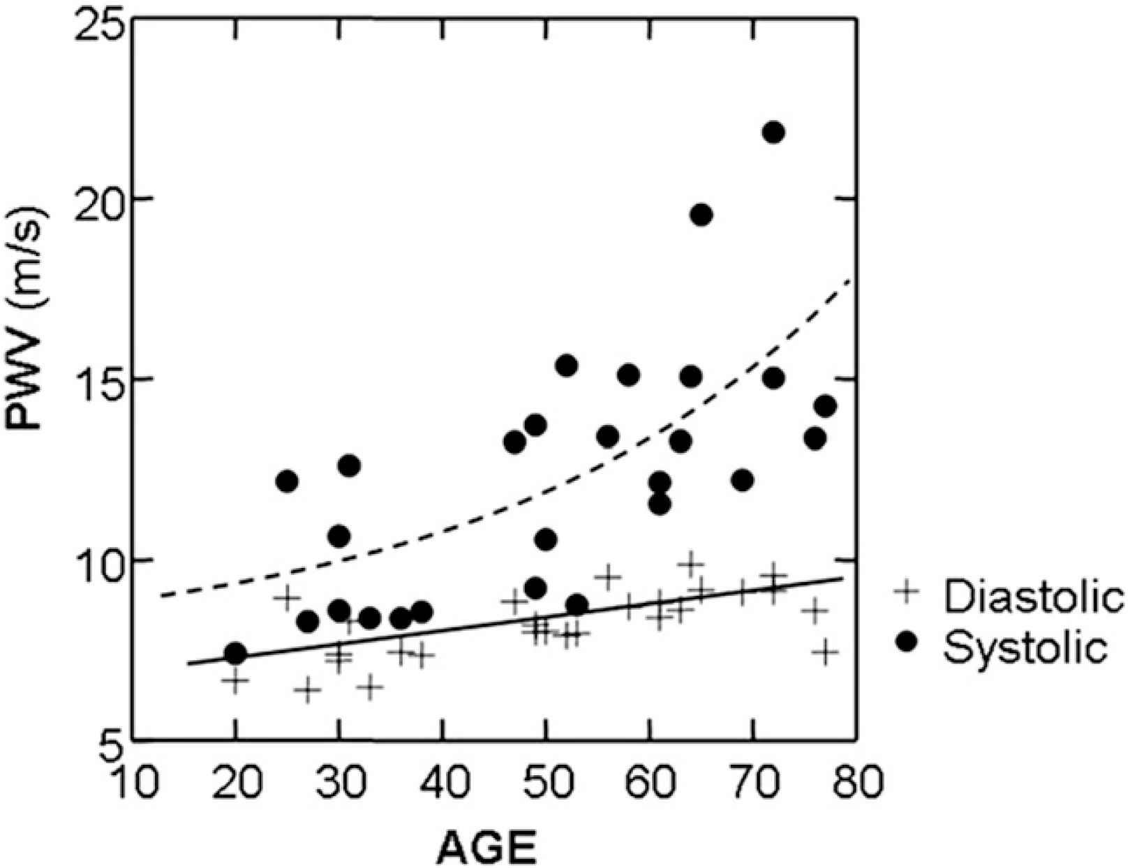 Conclusions: (1) The gravity effect on brachial DBP induces linear changes in diastolic PWV, which increase with age. (2) The dynamic changes of PWV and DBP may provide a novel and simple determination of systolic PWV, which shows greater age sensitivity than diastolic PWV.