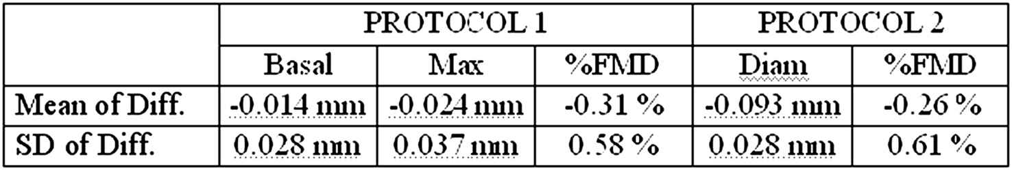 Protocol 2: brachial artery diameter (Diam) has been evaluated in 618 frames from 12 sequences. Diam value and %FMD have been considered for each frame. Bland-Altman analysis has been used. As shown in the table, the bias is negligible and the SD of the differences is satisfactory. In conclusion, the compared systems show a optimal grade of agreement and they can be used interchangeably. Thus, the use of a system characterized by real-time functionalities would represent a referral method for assessing endothelial function in clinical trial.