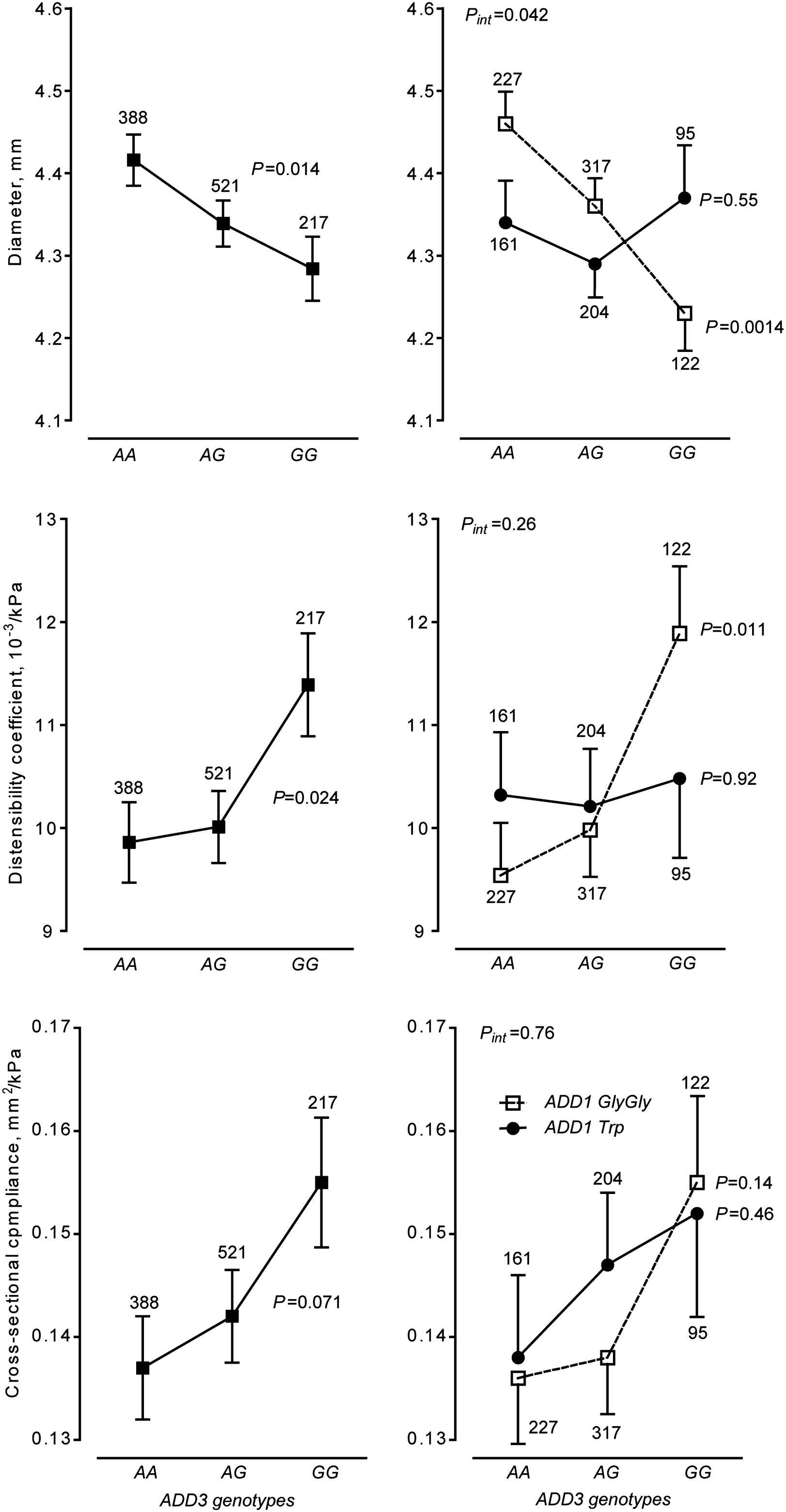 Diameter, distensibility and cross-sectional compliance of brachial artery in relation to ADD1 Gly460Trp and ADD3 A386G polymorphisms The analyses were adjusted for the observer, sex, age, body mass index, mean arterial pressure, heart rate, smoking, alcohol intake and the use of antihypertensive drugs and account for family clusters. Values are least square means ± SEs. The number of subjects contributing to each plotted point are given. P-values are linear trend across the ADD3 genotypes. Pint indicates the significance of the 2-way interaction between ADD1 and ADD3.