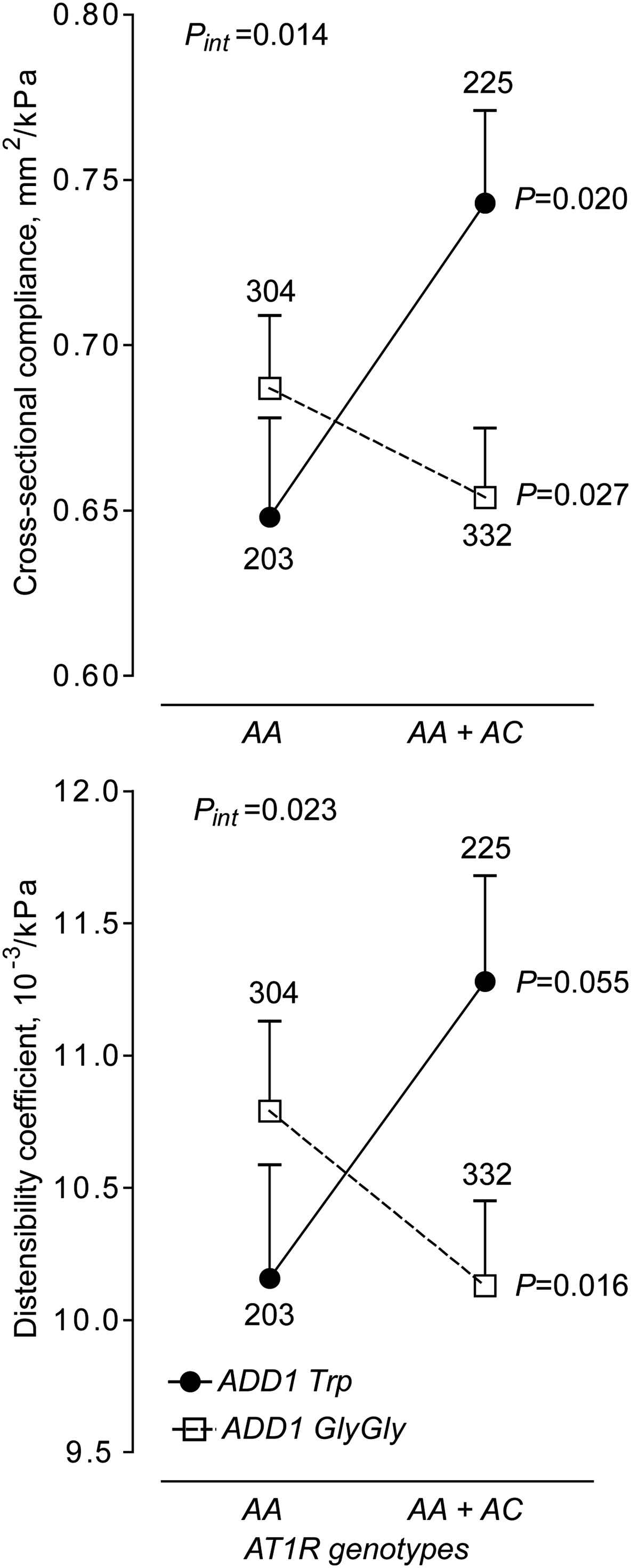 Femoral cross-sectional compliance and distensibility in relation to the ADD1 and AT1R genotypes The analyses were adjusted for the same covariates as in Fig. 1. Values are least square means ± SEs. The number of subjects contributing to each plotted point are given. P-values denote the siginificance of the difference between AT1R genotypes. Pint indicates the significance of the interaction between ADD1 and AT1R.