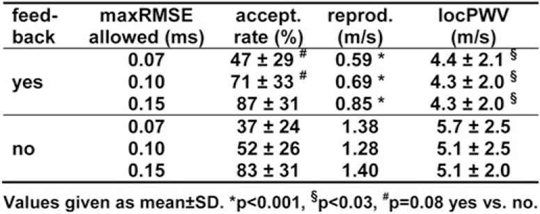 Conclusions: On-line visual feedback improves the quality of local pulse wave velocity measurements. With feedback, an RMSE threshold of 0.10 ms appears optimal in trading off measurement acceptance rate and reproducibility.
