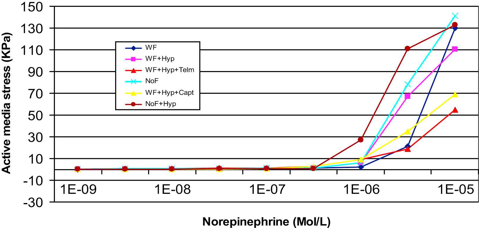 Results: Are summarized in the figure (active media stress: KPa, mean of two vessels for each rat).A significantly greater reactivity to NE was observed in NoF vessels compared with WF vessels(ANOVAp=0.003between curves).This increased reactivity is similar to that observed in WF+Hyp(ANOVAp= NS between, NoF and WF+Hyp).Captopril and Telmisartan were able to prevent the effect of hypoxia(ANOVA p<0.05 between WF+Hyp and WF+Hyp+Capt or Telm).