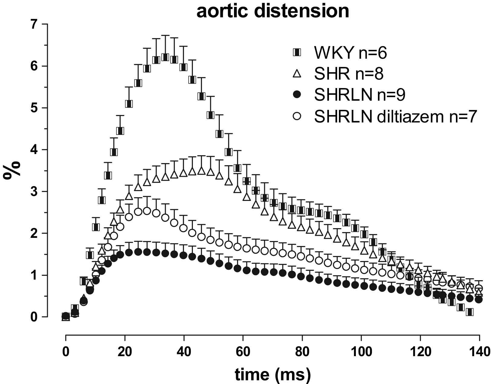 Results: Compliance and distensibility are decreased in SHRLN (<SHR<WKY) and stiffness index increased. From distension-pressure loop curves, ascending, descending slopes and isobaric ascending slope at 200 mmHg are reduced in SHRLN<SHR<WKY. If we plot pulsatile time-waveform curves of pulse pressure (PP) and distension in % (Figure), maximal values and waves kinetics are altered. We therefore calculate a distensibility index as area under the curves of distension/PP. Diltiazem i.v. in SHRLN decreases systolic BP and PP to values similar to those in WKY; compliance, distensibility and stiffness reach only the values of SHR. Isobaric compliance at 160 mmHg is < than in WKY and distension remains lower than in SHR.