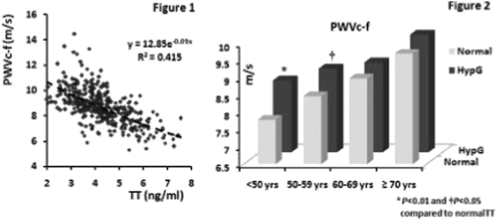 Conclusion: TT levels are independently associated with aortic stiffening. The effect of low testosterone concentration on aortic stiffness is emphasized in young men. These findings underline the important role of testosterone as a marker of arterial damage.