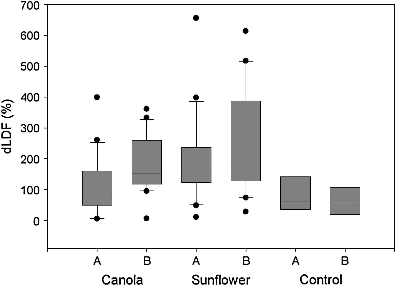 Box plot of difference of postischemic flow (dLDF) at baseline (A) and at the end of the study (B). Values are significantly different for canola oil A vs. B (p = 0.008), sunflower oil A vs. B (p = 0.03), canola oil vs. sunflower oil at baseline (p = 0.02), sunflower oil vs. control at baseline (p = 0.02), but not between canola oil vs. control at baseline (p = 0.78) and control A vs. B (p = 0.8).