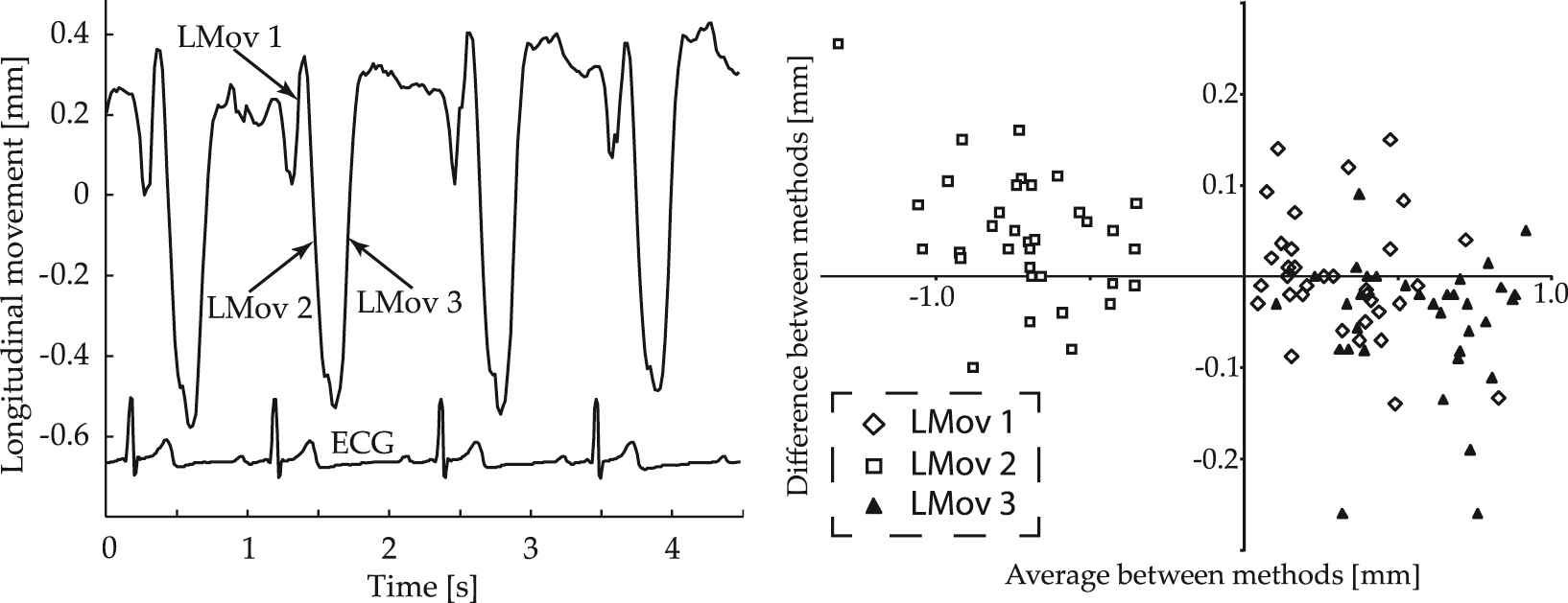 Figure 1 shows the longitudinal arterial wall movement of one volunteer. Three phases of longitudinal wall movement can be detected; an antegrade movement (LMov1) in early systole, a following retrograde movement (LMov2), and a subsequent antegrade movement (LMov3). The magnitude of the three phases of movement was mean 312 μm (SD 197), −706 μm (222) and 577 μm (218), respectively. The intra-observer variation for the different phases of movement was 21%, 13%, and 17%, respectively, compared to 14%, 13%, and 16% using our previously presented method. Figure 2 shows a Bland-Altman plot comparing the two methods. While the new method could make estimations in all cineloops, our previously presented method failed in six of them.