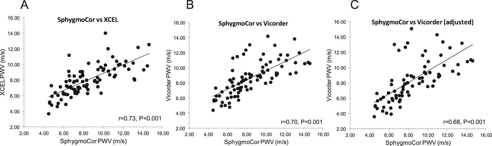 Correlation between SphygmoCor-derived PWV and XCEL (A), Vicorder (B) and Vicorder-adj (C) PWV values.
