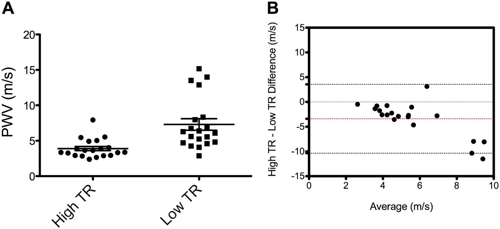 Results: There was a significant difference (p<0.0004) between PWV calculated using high TR mean 3.89m/s (SD 1.31) compared with simulated low TR, mean 7.30m/s (SD 3.64), Figure A. The mean bias between methods was 3.4m/s with wide limits of agreement (Figure B).
