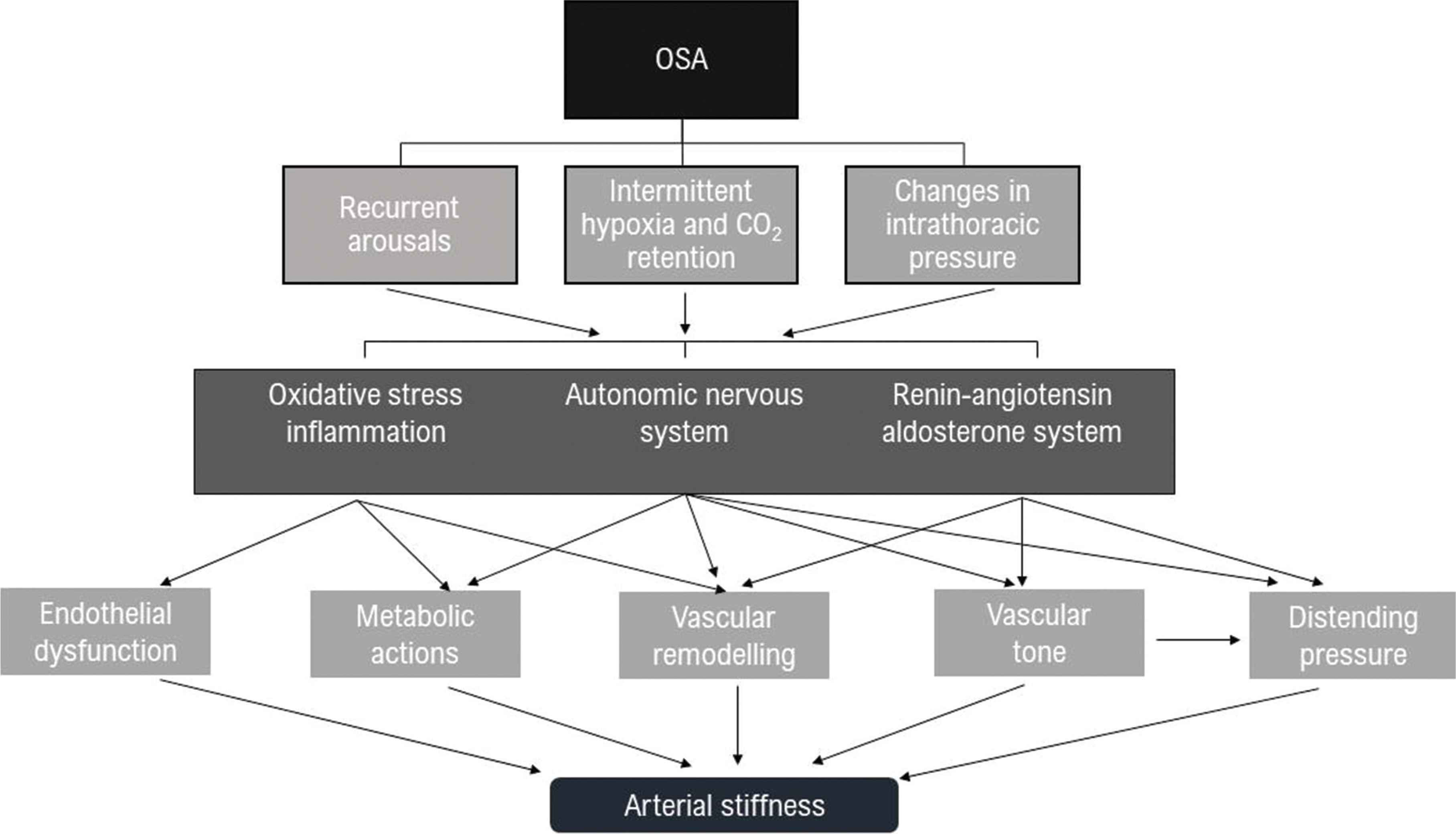 To summarize, a large body of evidence supports the role of OSA as a risk factor for increased arterial stiffness. Several pathophysiological mechanisms, including the activation of the autonomic nervous system, may help explain the link between the breathing disorder and the vascular alterations (here mainly examined as functional properties rather than remodelling). Whether a causal relationship between OSA and vascular damage exists or is mostly explained by confounders and whether OSA treatment can improve vascular stiffening is still debated. More RCTs are warranted and their design should consider changes in BP as one of the main confounders in the analysis.