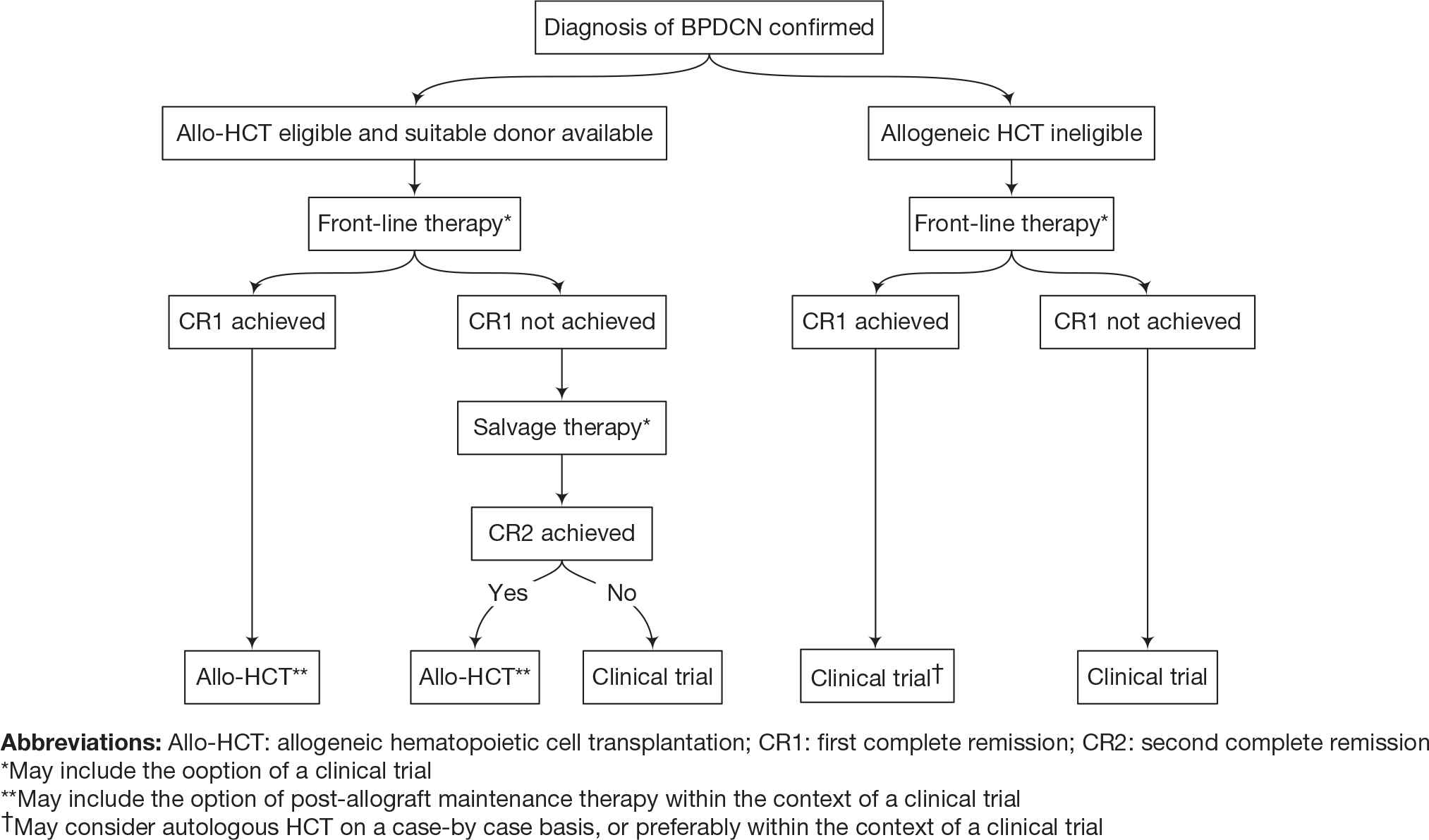Given the historically poor outcomes and short OS in most patients with BPDCN, allo-HCT is recommended as frontline consolidation in patients who achieve a CR and are deemed eligible for the procedure, as this remains the only proven long-term curative strategy at the present time (Fig. 1). Patients with BPDCN should be promptly referred to transplant centers to confirm their candidacy for allo-HCT and to initiate the process of identifying a suitable HLA-compatible donor. The potential benefit of maintenance therapy after allo-HCT is an important research question which should be studied in prospective clinical trials. Patients who are deemed ineligible for an allo-HCT due to lack of response to treatment and/or poor performance status should be considered for enrollment in clinical trials (Fig. 1).
