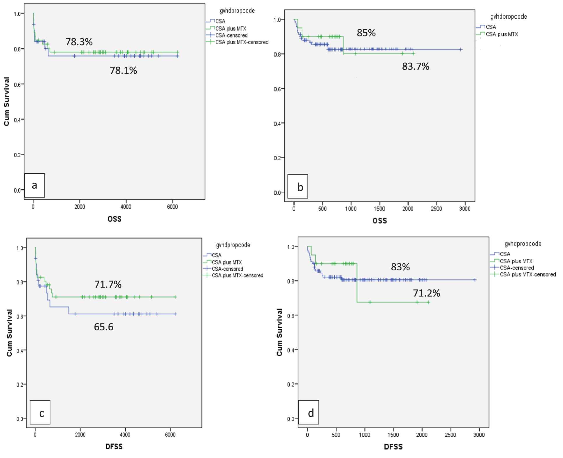 Effect of GVHD prophylaxis on OS and DFS (a) In Gp1: OS with Cyclosporine (blue line) alone and Cyclosporine plus MTX (green line) was 78.1% and 78.3% respectively with p = 0.163 (b) In Gp2: OS with Cyclosporine alone (blue line) and Cyclosporine plus MTX (green line) was 85% and 83.7% respectively with p = 0.671 (c) In Gp1: DFS 65.6% in Cyclosporine alone (blue line) while 71.7 % in Cyclosporine plus MTX (green line), p = 0.165 (d) In Gp2: DFS 83% in Cyclosporine alone (blue line) while 71.2 % in Cyclosporine plus MTX (green line), p = 0.06. OS: overall survival; DFS: disease-free survival; MTX: methotrexate; GRFS: graft versus host disease free relapse free survival.