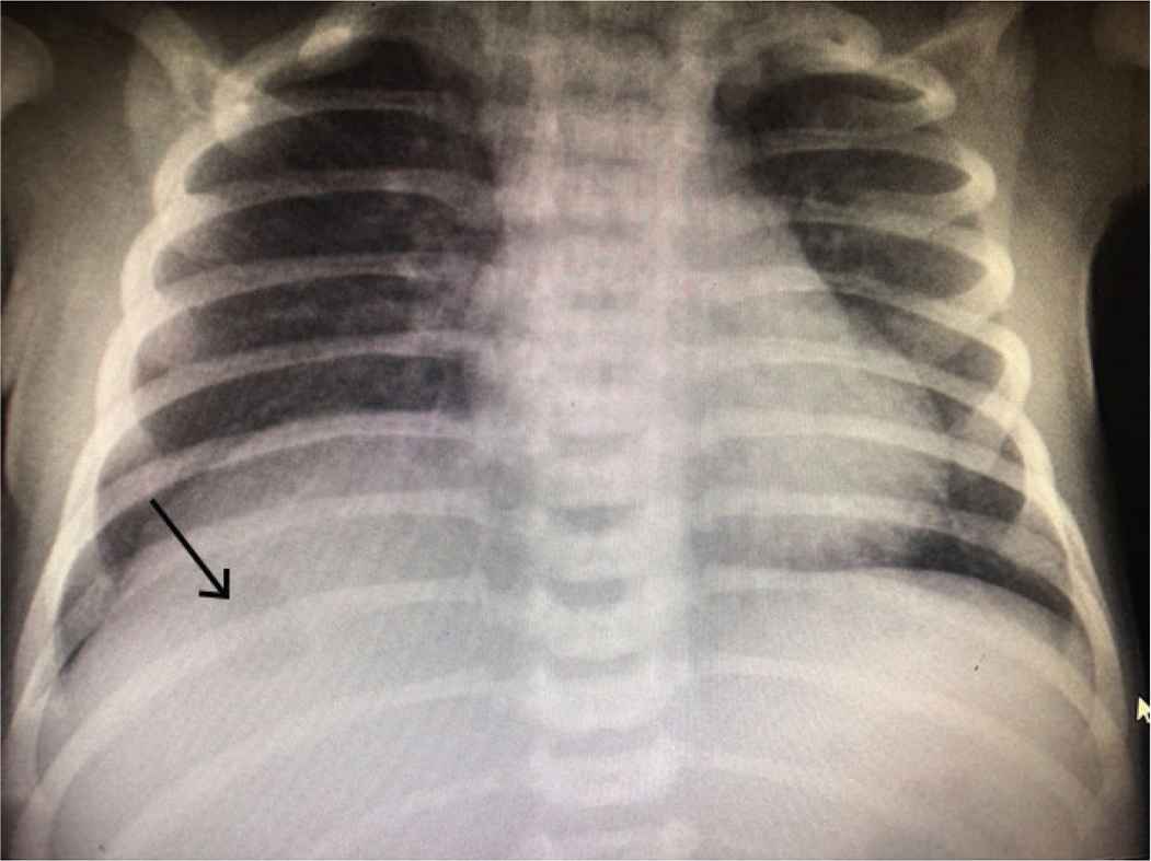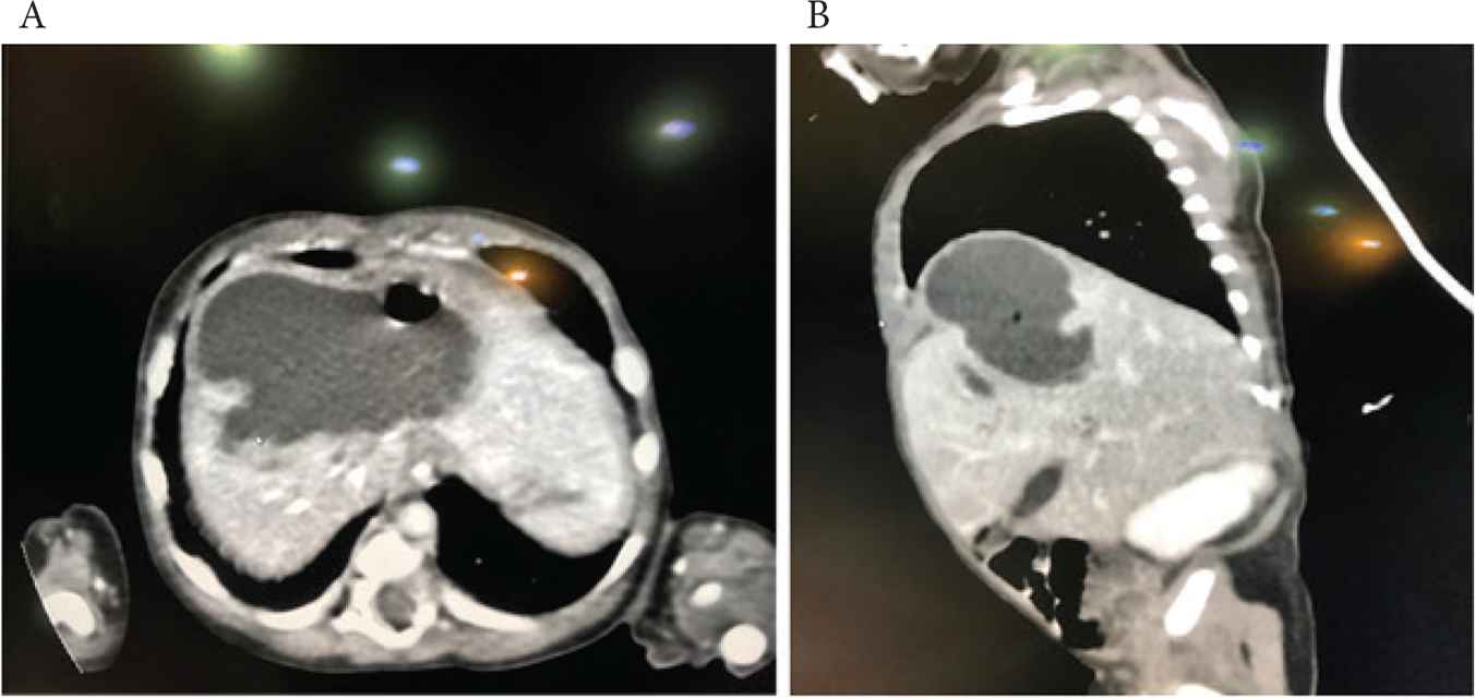 A 16-day-old term, male baby, birth weight 3.1 kg, was transferred to our NICU with sepsis. The Blood Culture and Sensitivity (C/S) was persistently positive for coagulase-negative staphylococci. He was born in the referring hospital by spontaneous vaginal delivery and admitted to their NICU due to meconium aspiration syndrome. He required ventilation for 1 week and an Umbilical Venous Catheter (UVC) was placed in the portal vein at birth. The UVC remained in this position for 6 days with Total Parenteral Nutrition (TPN) running through it. A chest drain was required for right pneumothorax. On admission to our hospital, he had hepatomegaly with raised C-Reactive Protein (CRP). Abdominal X-ray showed enlarged liver with high right-side diaphragm and a small 1 × 1 cm2 air bubble in the liver Figure 1. Abdominal US showed a heterogeneous multiloculated collection in the right liver lobe indenting the right hemidiaphragm, suggestive of liver abscess. Abdominal computed tomography (CT) showed a large multiloculated hepatic abscess with its main bulk in the right hepatic lobe with upper subcapsular extension causing right diaphragmatic elevation and showing multiple air loculi inside suggesting anerobic infection Figure 2A and 2B. The abscess was drained by an emergency laparotomy and an indwelling drain was placed. The C/S from pus was negative, while biopsy from the abscess wall showed nonspecific acute and chronic inflammation with granulation tissue. CRP gradually normalized, the drain was removed, and the baby recovered very well.