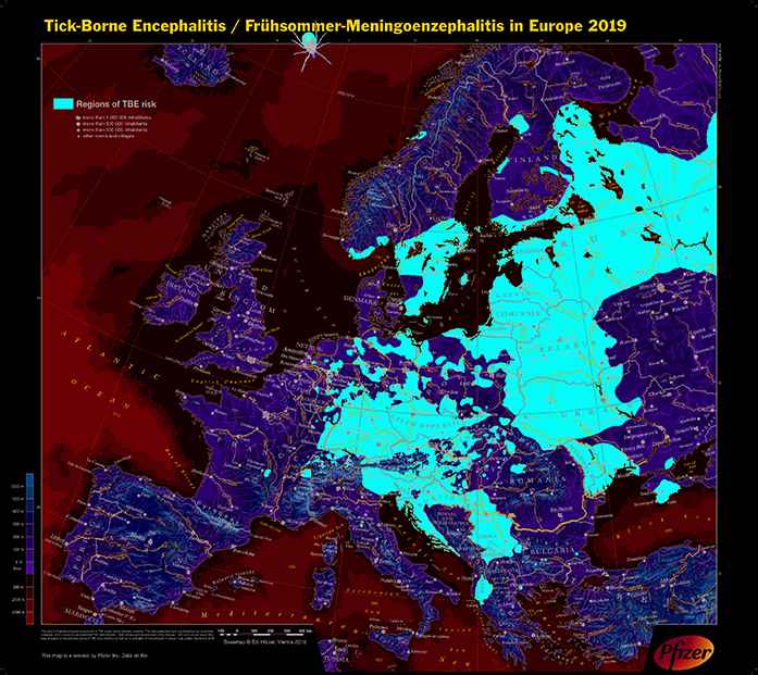 Tick-borne Encephalitis (TBE) is an arboviral infection widespread in Europe and northern parts of Asia. Ticks transmit the associated flavivirus usually between March and November to people with outdoor activities in the countryside, in gardens or, rarely, in urban parks. The clinical picture of TBE has two phases: after an uncharacteristic febrile illness and a brief interval in which neurological symptoms occur in a minority of the infected patients. In children, meningitis is the predominant syndrome, whereas the proportion of patients with more severe encephalitis and encephalomyelitis increases with growing age. Consequently, children may suffer from cognitive defects and adults from neurological defects after the acute phase. As there is no therapy for TBE, prevention is of paramount importance. The first line of defense is to avoid tick “bites” (actually stings). Various effective and well-tolerated vaccines are marketed in Europe, all parts of Russia, and in China.