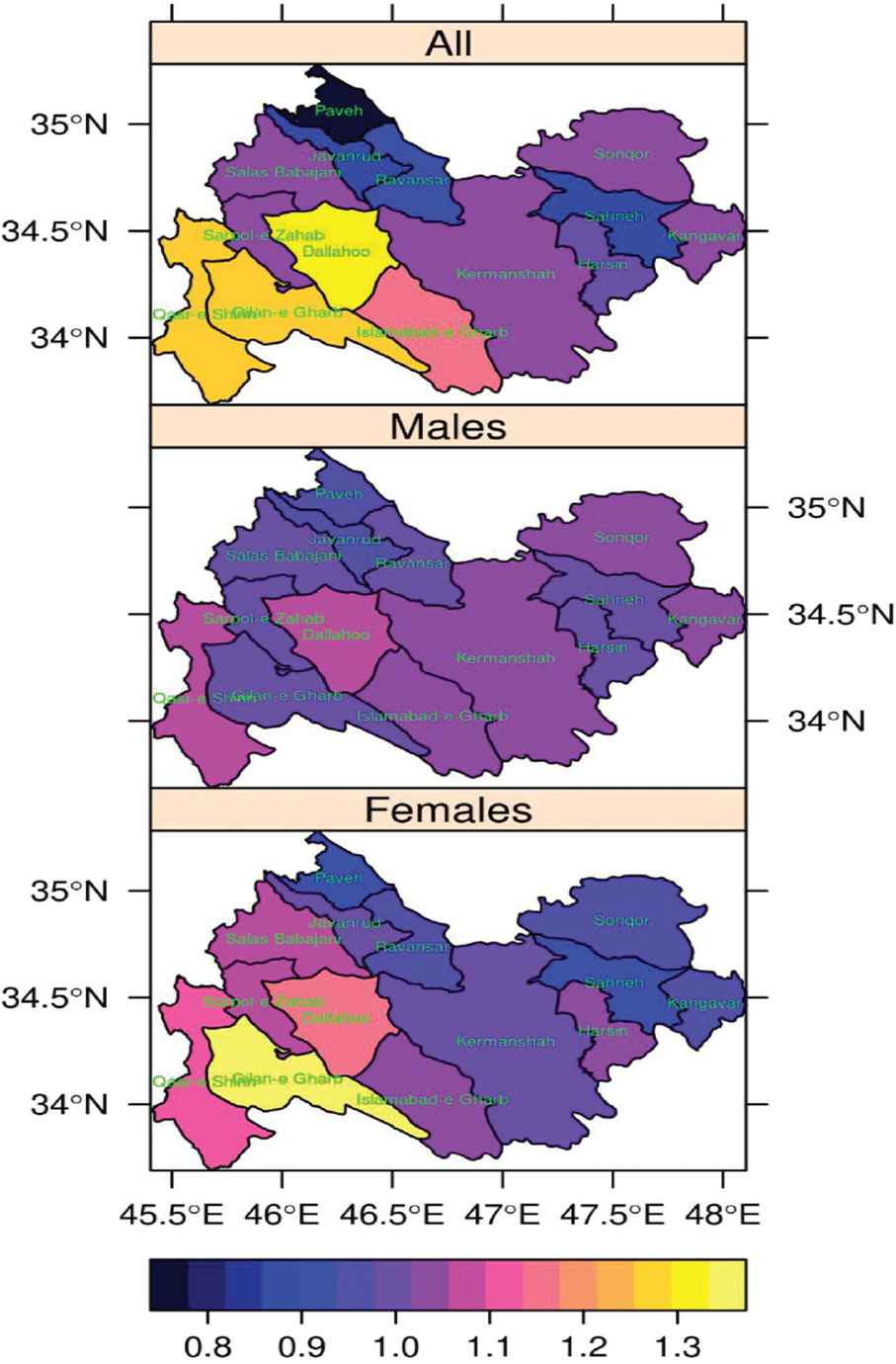 A total of 262 complete suicide cases were registered, with age ranging from 10 to 89 years, during the selected period. As shown in Table 1, the observed and estimated expected number of the complete suicide cases in each county of Kermanshah province for males, females, and all persons were calculated. Based on this calculation, Figure 1 shows the map of posterior mean of the county-specific relative risk. Demonstration of spatial (geographical) distributions enables the visual display of disparities within designated geographical areas. It can be seen that for all individuals, Dallahoo, Gilan-e Gharb, and Qasr-e Shirin are counties with high relative risk; also Paveh, Javanrud, and Ravansar fall into the low relative risk category. For females, Paveh, Sahneh, Sonqor, and Kangavar fall into the low relative risk category; moreover, Gilan-e Gharb is a county with high relative risk. For males, Paveh and Javanrud fall into the low relative risk category. This map reveals gender and spatial disparities in the suicide mortality relative risk in the county level, although it was not statistically significant. This finding is in line with past findings from studies that were conducted from 2006 to 2011 [5]. Findings from this study can be used to aid priority setting for suicide prevention interventions. In terms of the Human Development Index (HDI) [13], Iran ranks 60th among 189 countries in 2018. In Iran, the HDI was 0.834 for men and 0.726 for women [14]. This difference can be effective in justifying gender inequality in the distribution of suicide-related mortalities.