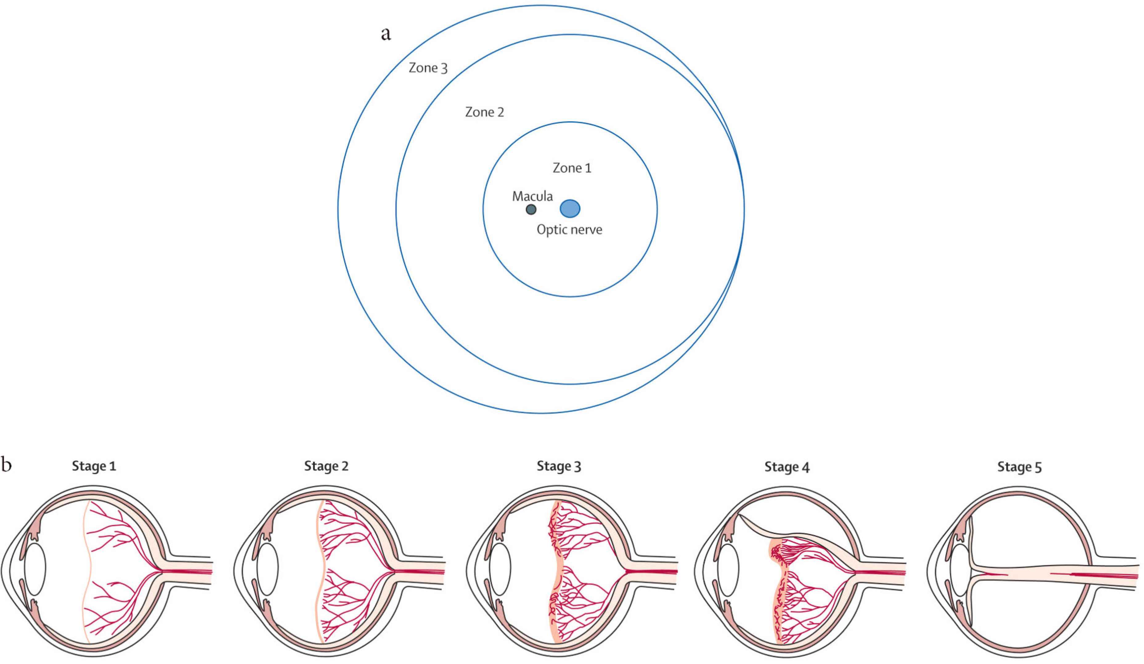Zones and stages of retinopathy of prematurity. (a) Diagram shows the retina in the right eye is divided into three zones. (b) Classification of retinopathy of prematurity: Stage 1, a thin demarcation line between vascularized and nonvascularized retina; Stage 2, a ridge; Stage 3, an extraretinal fibrovascular proliferation; Stage 4, partial retinal detachment; and Stage 5, total retinal detachment.