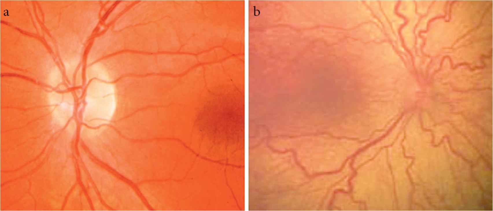 Stages of retinopathy of prematurity. (a) Normal retina vessels. (b) Plus disease showing venous dilation and increased arterial tortuosity of posterior vessels.