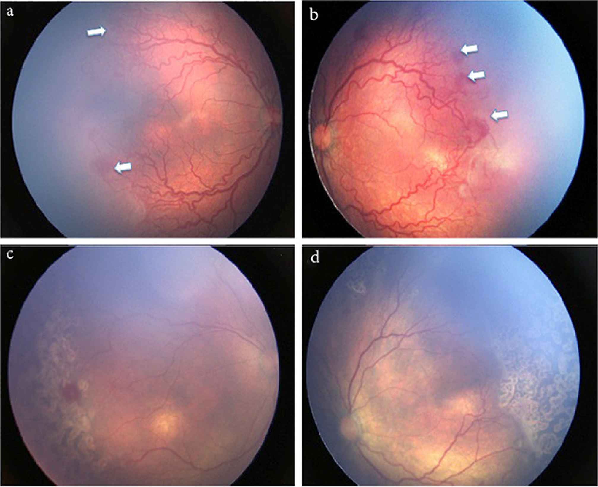 (a and b) Both eyes demonstrating Aggressive Posterior Retinopathy of Prematurity (APROP) that show neovascularization at the junction of vascular and avascular retina in Zone I (white arrow) and with presence of plus disease. (c and d) After laser photocoagulation showing regressed ROP and laser scars.