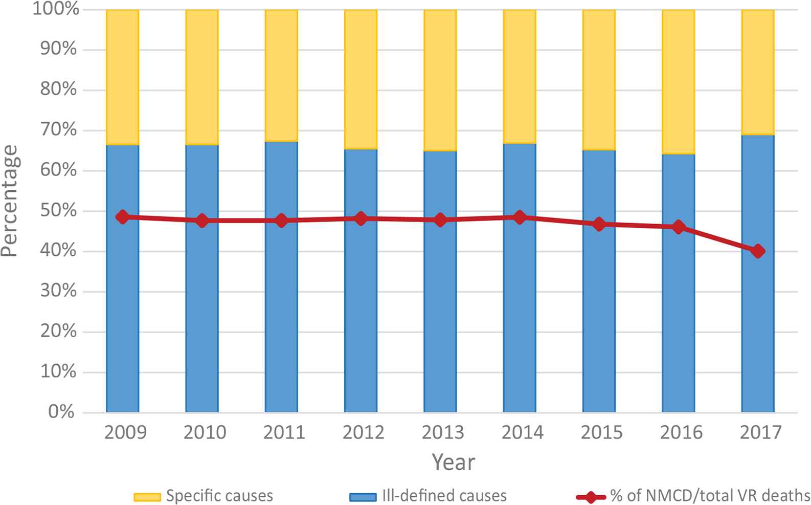 Trends in proportions of deaths assigned specific and ill-defined causes among Nonmedically Certified Deaths (NMCD) in Malaysian vital registration data, 2009–2017.