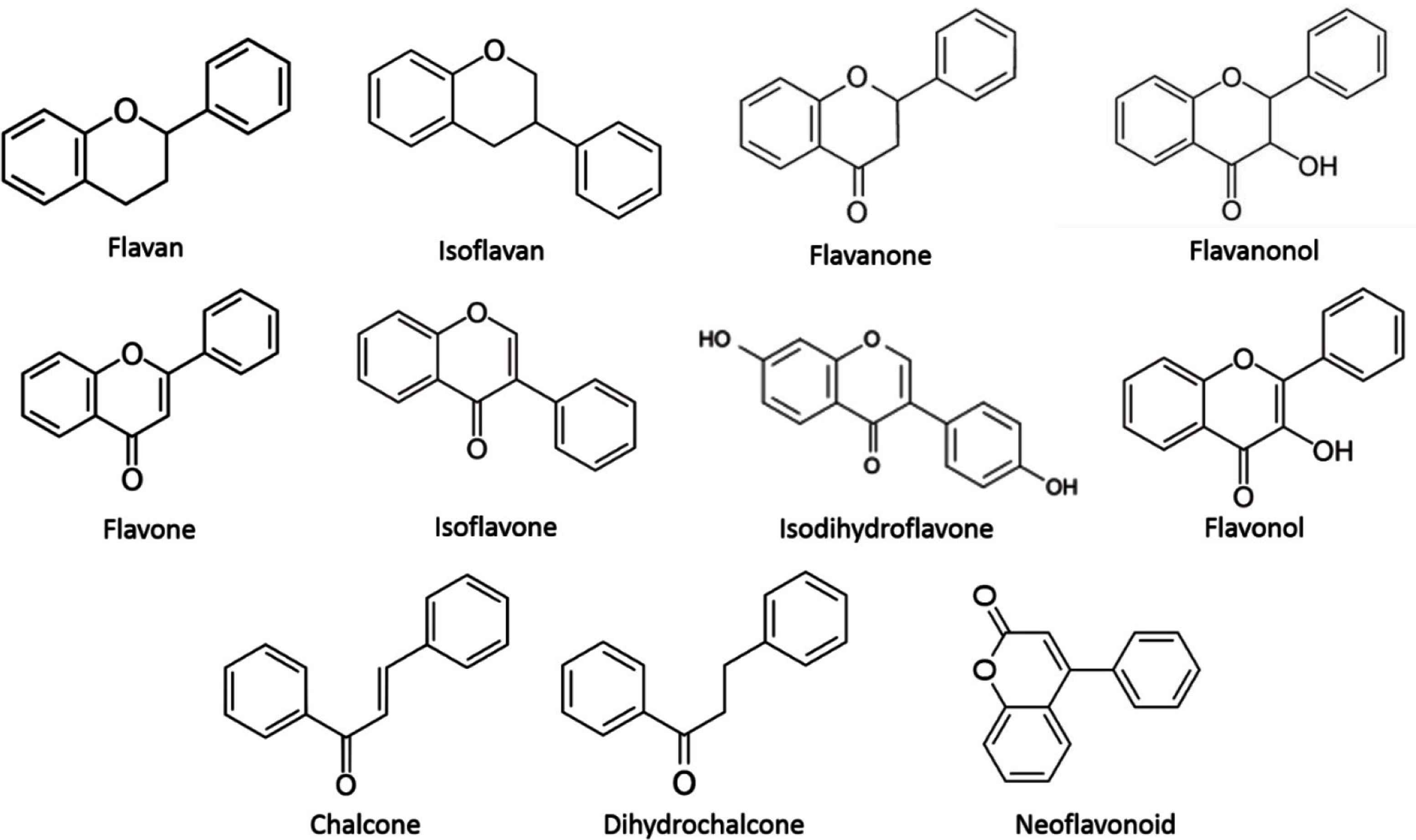 As mentioned, among phenols, flavonoids are the most important propolis constituents, acting as the main biologically active ingredients. They are also used in determining the quality of propolis samples [39]. Walker and Crane [24] reported at least 40 known flavonoids from propolis, whereas Marcucci [6] reported at least 44 in 1995. Bankova et al. [11] mentioned seven newly isolated flavonoids in propolis between 1995 and 2000, but just between 2000 and 2012, an astounding 113 new flavonoids were isolated [8]. Despite high numbers of already isolated flavonoids, 92 (including their glycosides) were discovered in propolis for the first time between 2013 and 2018. According to their chemical structure, isolated flavonoids are classified into 11 subclasses: flavans, isoflavans, flavanones, flavanonols, flavones, isoflavones, isodihydroflavones, flavonols, chalcones, dihydrochalcones, and neoflavonoids (Figure 1). Besides flavonoids, their glycosides are also being discovered in propolis, although until 2012 they were considered very rare. Only two flavonoid glycosides were isolated from propolis until 2009 and until 2012 their number grew only by one [8,40]. Yet in the past 6 years, 57 flavonoid glycosides were isolated from propolis for the first time, making flavonoid glycosides an important group of compounds in propolis samples. In 2004, some speculations were made that propolis samples could also contain anthocyanidins, although they have yet to be reported in propolis [41].