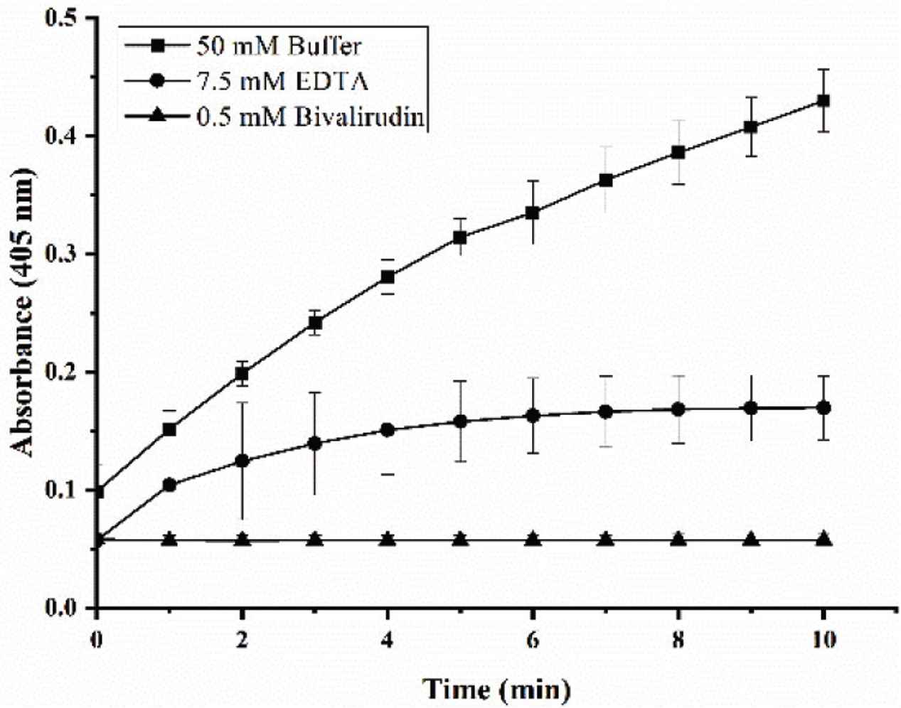 Effect of different samples on absorbance. 0.5 mM bivalirudin (▴) was added as positive control, 7.5 mM EDTA (⦁) was added as metal ion chelating agent without antithrombin activity and 50 mM Tris-HCl buffer (▪) was added as negative control.