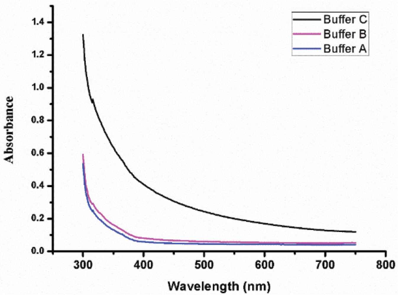 Effect of different buffers on absorbance. Buffer A (blue) was 50 mM Tris-HCl with 0.12 mM NaCl. Buffer B (magenta) was 50 mM Tris-HCl with 0.12 mM NaCl and 2 mM CaCl2. Buffer C (black) was 50 mM Tris-HCl with 0.12 mM NaCl and 15 μM ZnCl2.