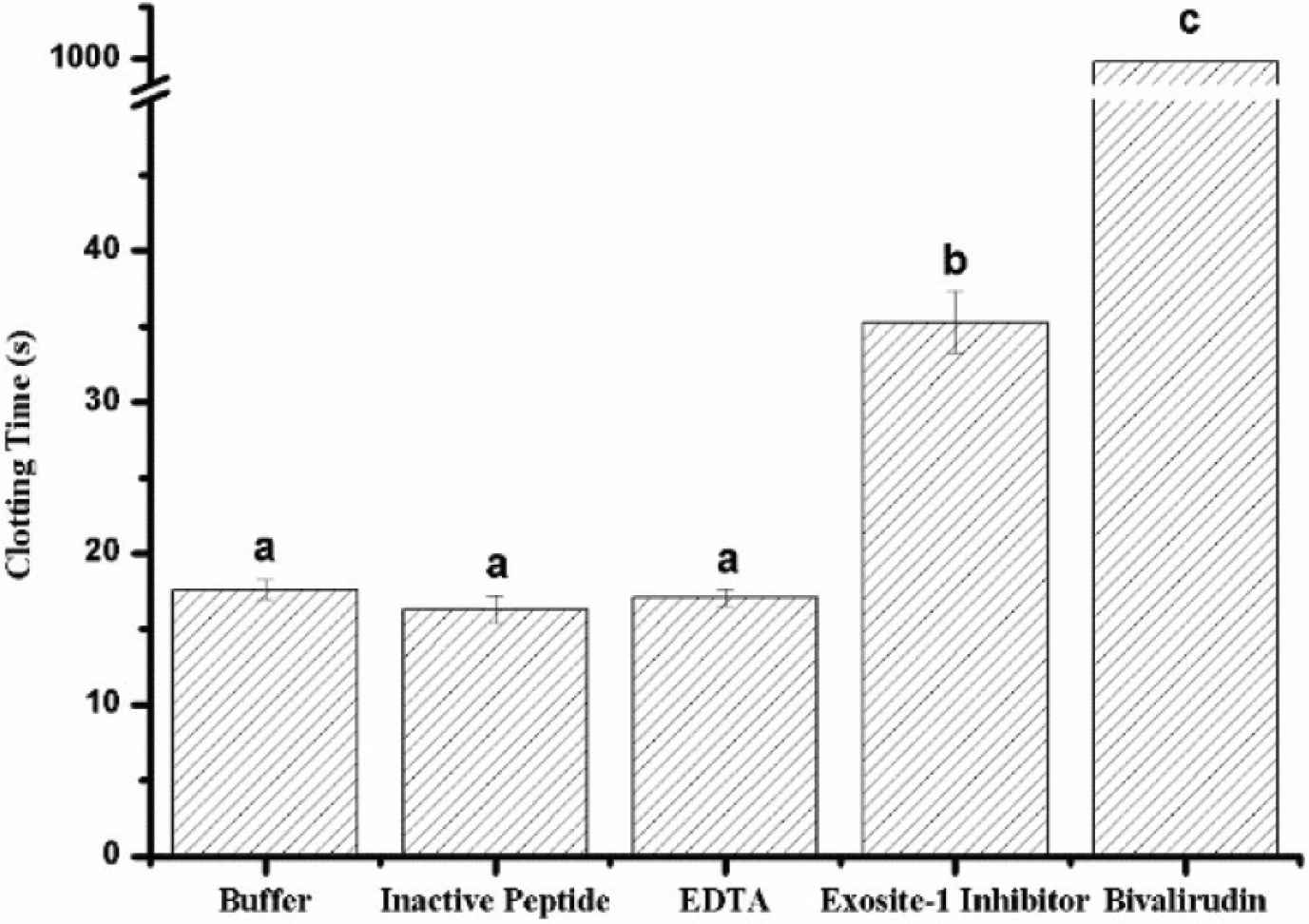 Fibrinogen clotting time of different samples. Thrombin exosite-I inhibitor and bivalirudin (bivalent direct thrombin inhibitor) have significant difference compare with buffer (blank) but inactive peptide (negative control) and EDTA are not.