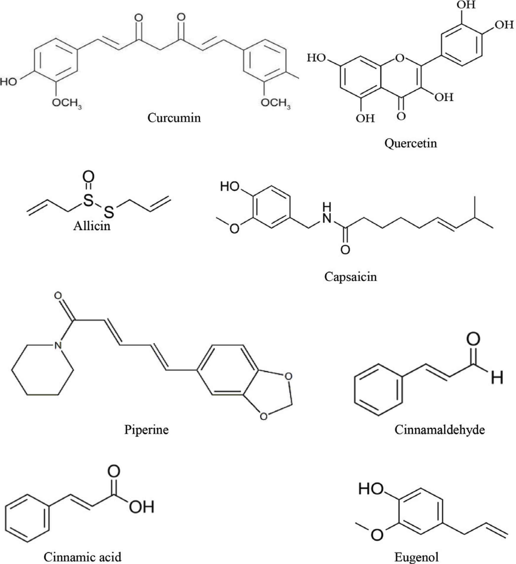 The pictures of some common tropical spices is depicted in Figure 1. The various spices are often mixed with diets containing cereals, legumes, nuts, fruits, vegetables, milk and milk products. They also serve as basic ingredients in preparing soup with ability to improve nutritional benefits of food and/or food products. However, spices are not among the suggested food groups required to get balanced diets [70]. Beside their nutritional importance, they could also provide added significant medicinal values. Many studies have reported that spices possess phenolic-rich constituents which provides the molecular basis for their added medicinal benefits [11,71,72]. The chemical structures of major phenolic compounds in the selected tropical spices are shown in Figure 2. The various reported medicinal importance of these phytochemicals include purgative, laxative, expectorant, carminative, diuretic, antioxidant, antimicrobial, hypolipidemic, antidiabetic, anti-inflammatory, anticarcinogenic, antihelminthic, hypocholesterolemic, antihypertensive, antidiabetic and neuroprotective effects amidst others [67,73–75]. Specifically, phytochemical compounds in spices like red chilli pepper, onion, garlic, turmeric, mustard and horseradish have been reported to possess expectorant activities [76,77]. Thus, this review shows that spices are important functional food ingredients which might mitigate and assuage the symptoms, side effects and fatality of COVID-19.