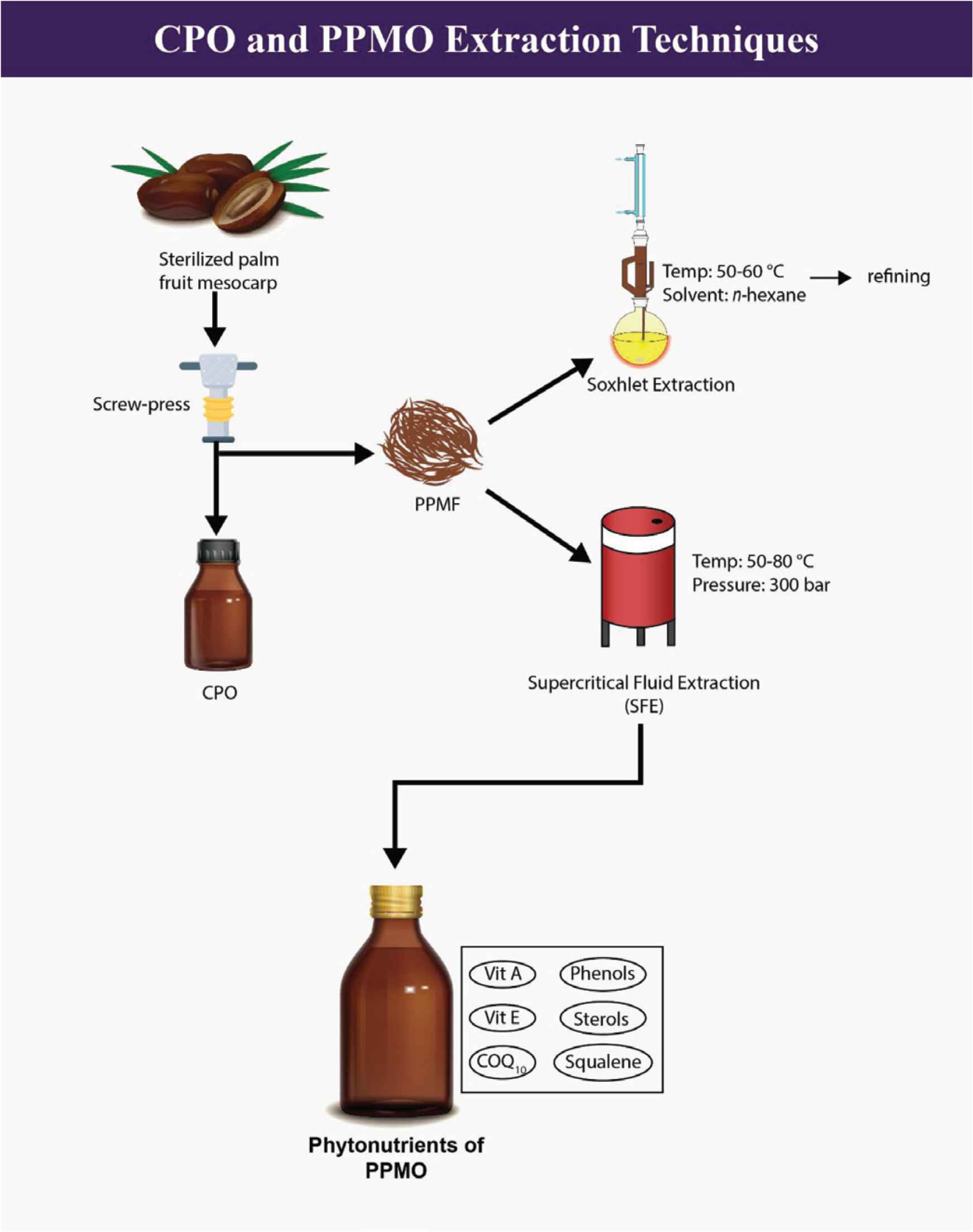 Extraction methods of Crude Palm Oil (CPO) and Palm-pressed Mesocarp Oil (PPMO).