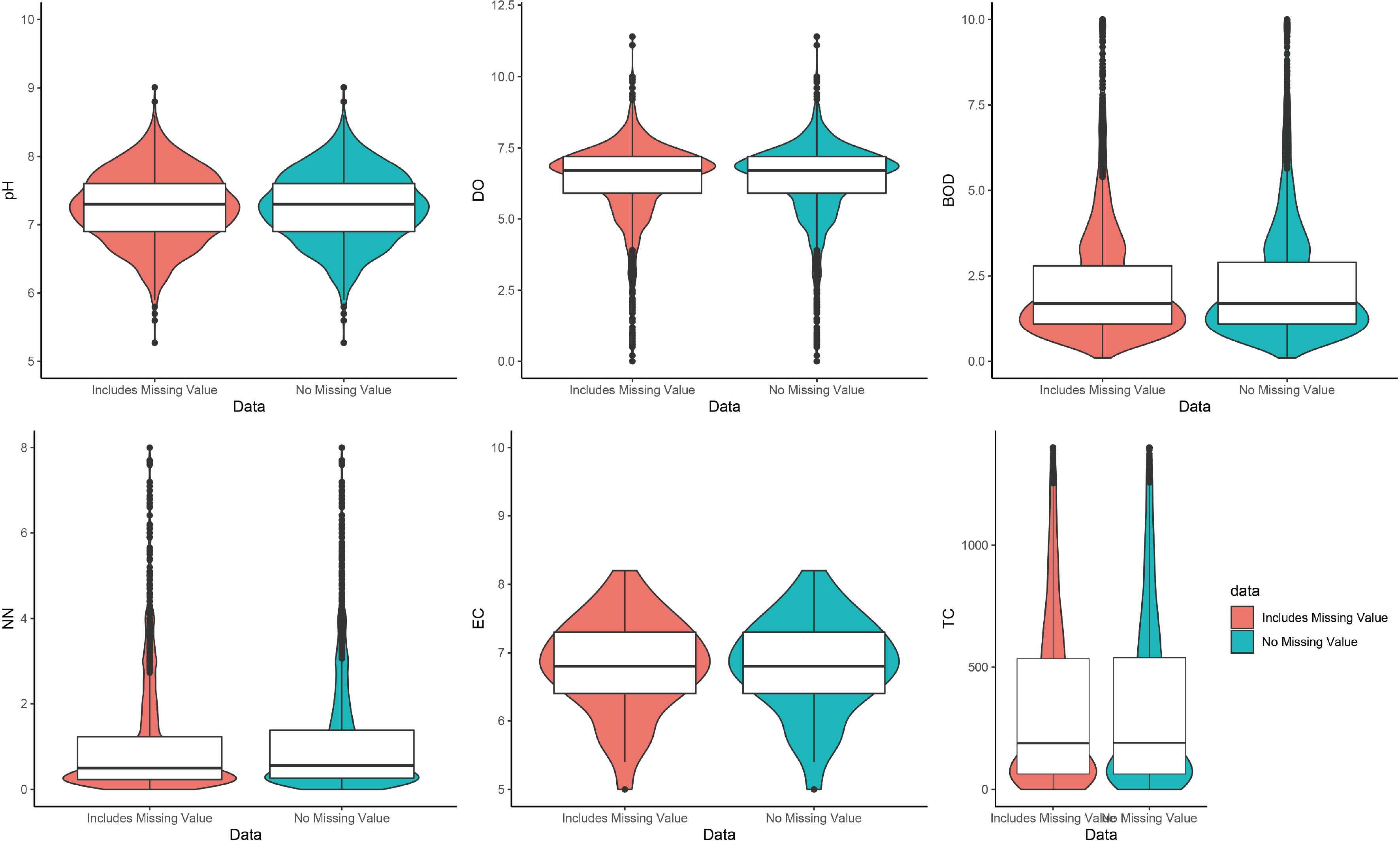 In this work, the data distribution is shown in Figure 3 of these six features. All the features data has distributed differently with missing value and without missing value.