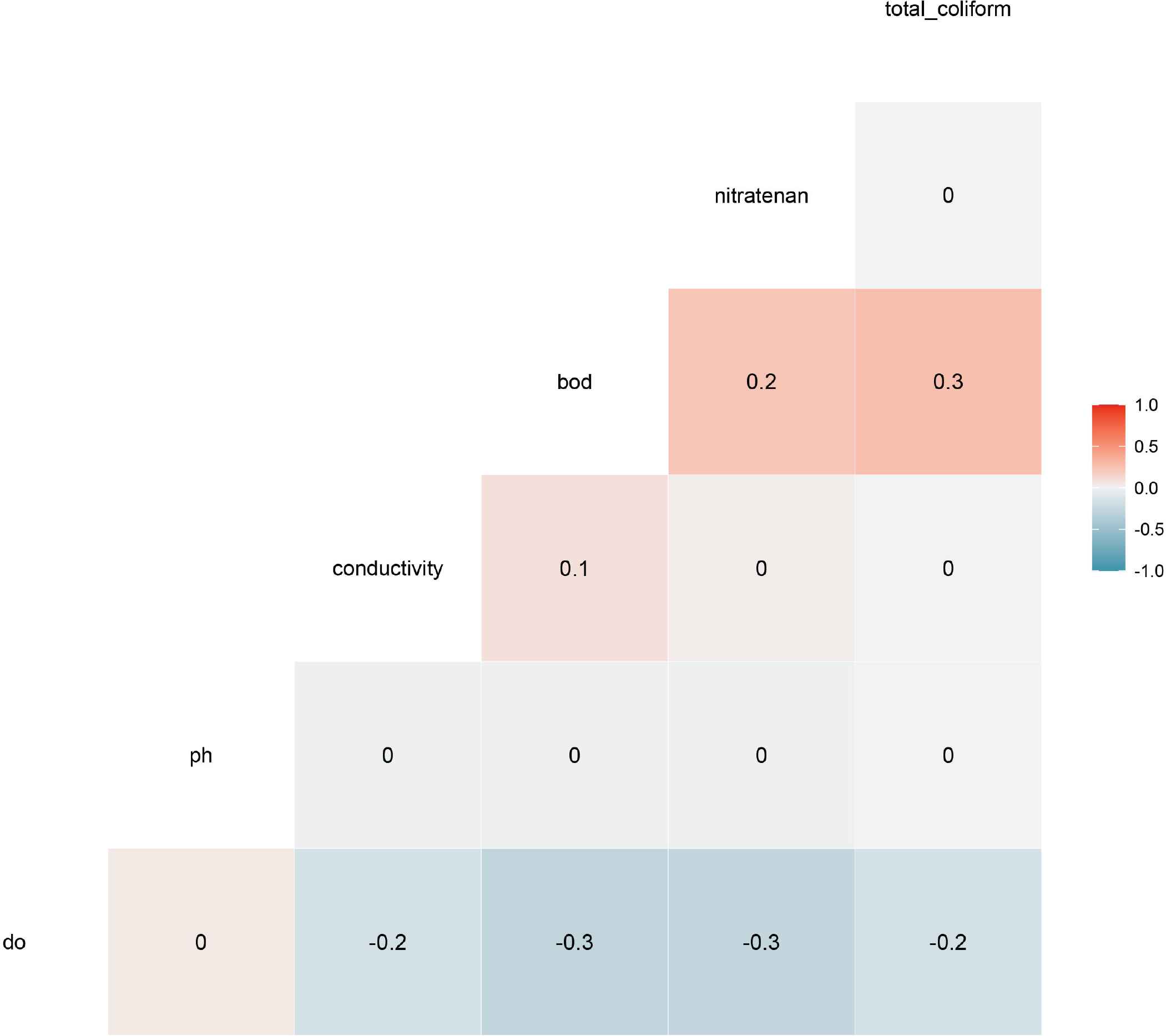 A correlation matrix is just a table that shows the correlation coefficients for various features. The matrix represents all potential value pairs in a table. It can also be useful for detecting and presenting trends. Figure 4 illustrates the correlation matrix of the characteristics in this dataset. In this Figure 4 BOD is positively correlated between nitrate and total coliform and the value is +0.2 and DO and BOD is negatively correlated with −0.3 value.