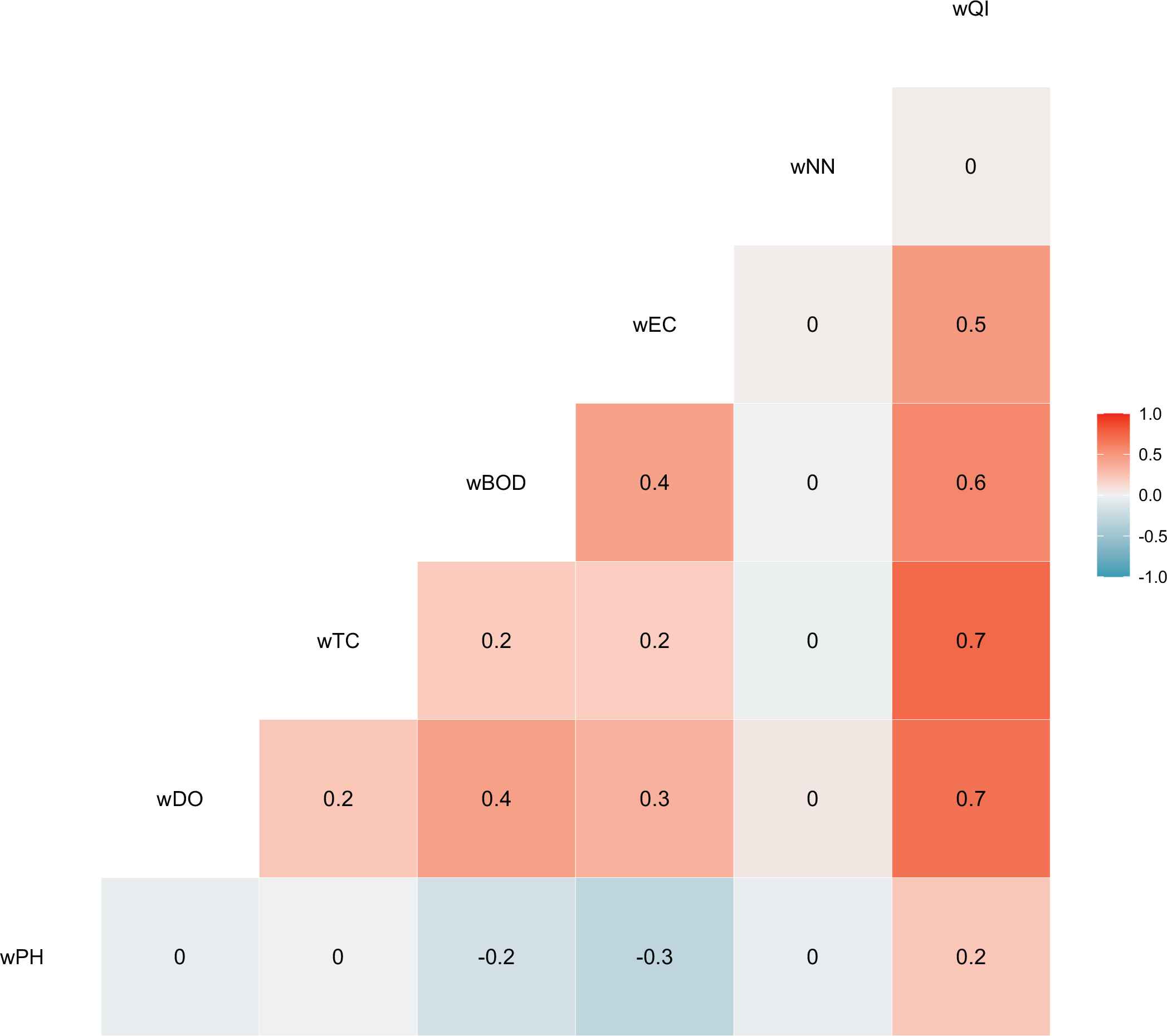 Figure 5 illustrates the feature correlation matrix of the characteristics in this dataset after pre-processed the dataset. Here, this figure shows that the TC and DO is positively correlated with WQI and the value is +0.7 and EC is negatively correlated with PH and −0.3 value.