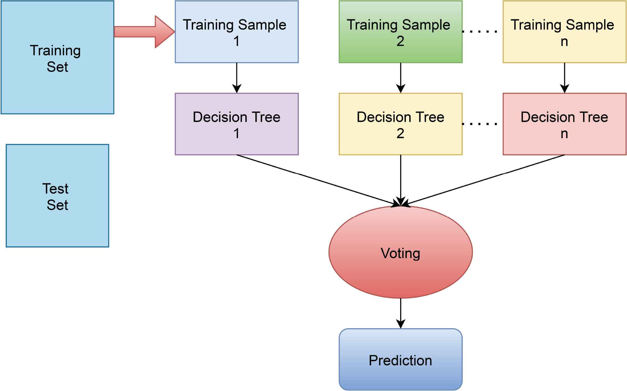 An ensemble learning approach for regression, classification, and other complications that works by training a large number of DT. It builds decision trees from samples and uses majority voting for classification and regression. Because random forests work with subsets of data, they are faster than decision trees. So, we can easily solve hundreds of features without any complication [16]. Figure 6 depicts the random forest algorithm’s flow.