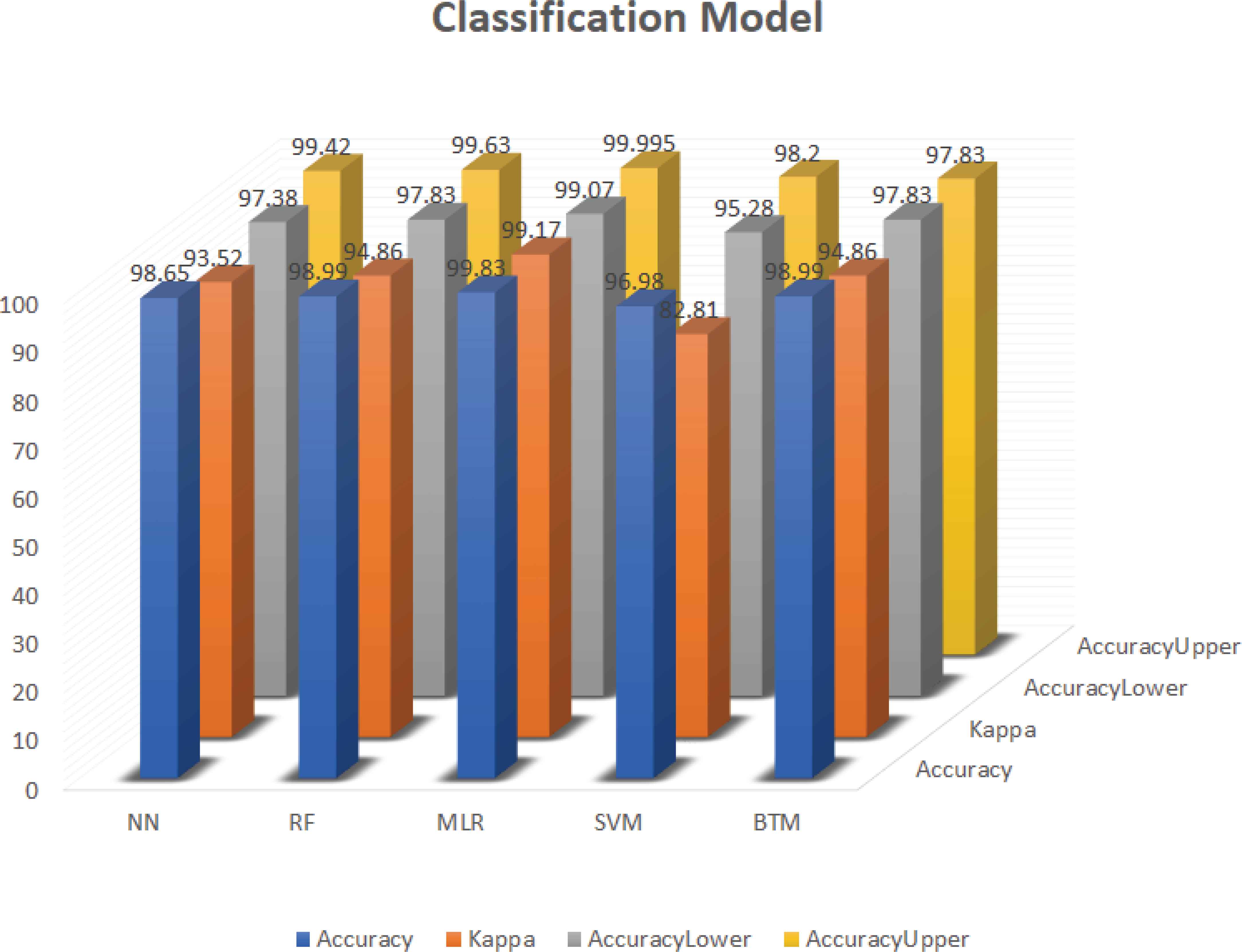 We have applied numerous algorithms for developing our classification model based on our dataset [y]. Using five classifiers, we have utilized Neural Network (NN), RF, MLR, SVM, and Bagged Tree Model (BT). Various levels of accuracy with the kappa values have been achieved by the classifiers we have examined for our classification. We have applied each of the classifiers mentioned before to our dataset and after applying those algorithms, we have achieved the highest accuracy, the lower accuracy and have found out the average accuracy by utilizing those algorithms. Among the RF, NN, MLR, BTm, and SVM models, MLR has the highest accuracy at 99.83%, while SVM has the lowest accuracy at 96.98%. The highest kappa value has also been obtained through the MLR model with the value of 99.17% and the lower kappa value was 82.81%, which has also been obtained through SVM (Table 4).