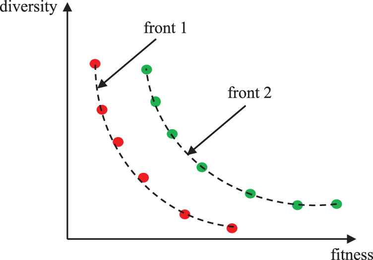 NSGA-II is a classical multiobjective optimization algorithm. It is necessary to note that the conflicting objectives are the prerequisite for the multiobjective optimization problems. The major problem of the optimization algorithm is the balance between the exploration and exploitation. However, the exploration and the exploitation are the conflicting objectives. Generally, the exploration efficiency is depended on the distribution of particles, namely population diversity, while the exploitation efficiency is associated with the fitness of particles. Then, diversity and fitness can be used to indirectly measure the exploration and exploitation, respectively. In view of this idea, NSGA-II can be employed after constructing two objectives, diversity and fitness.