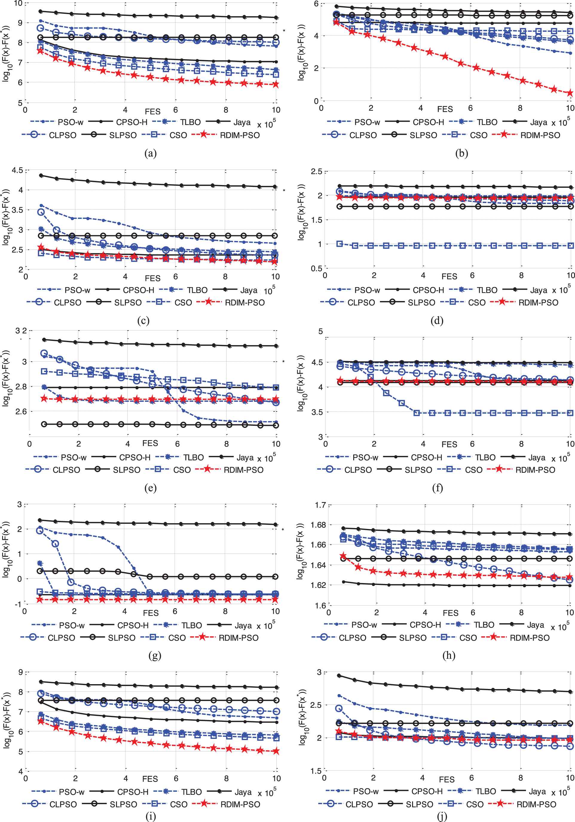 To illustrate the convergence speed of the proposed RDIM-PSO, the convergence curves on 30-dimensional, 50-dimensional and 100-dimensional CEC2014 benchmark problems are presented in Figures 12–14, respectively. There are 16 representative problems including 2 unimodal problems, 6 multimodal problems, 4 hybrid problems and 4 composite problems. The curves illustrate mean errors (in logarithmic scale) in 30 independent simulations of PSO-w, CPSO-H, CLPSO, SLPSO, TLBO, CSO, Jaya and RDIM-PSO. As mentioned above, the curves indicate that, in most problems, RDIM-PSO either achieves a fast convergence or behaves similarly to it.