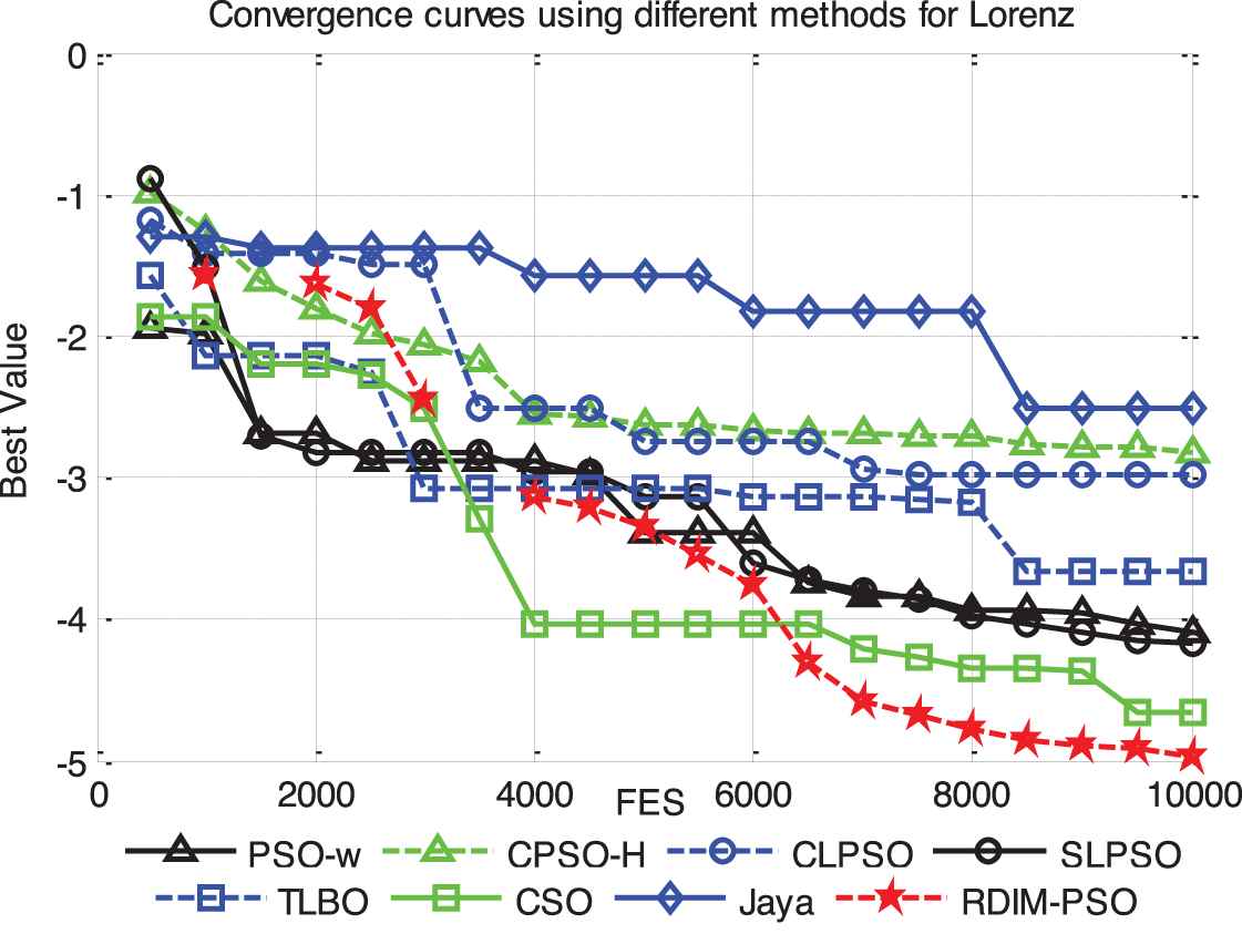 Table 21 shows that RDIM-PSO outperformed the other algorithms. The mean deviation of the training error and testing error obtained by RDIM-PSO is ranked first of the eight algorithms. Concerning the standard deviation of the training error and testing error, CSO performs best and RDIM-PSO ranks second. The training and testing curves for 2000 samples are shown in Figure 18. The convergence process of the average MSE for all algorithms is displayed in Figure 19. The figure shows that the convergence speed of RDIM-PSO is faster than that of the other algorithms for Lorenz system. The experimental results indicate that the approximate accuracy of RDIM-PSO is high.