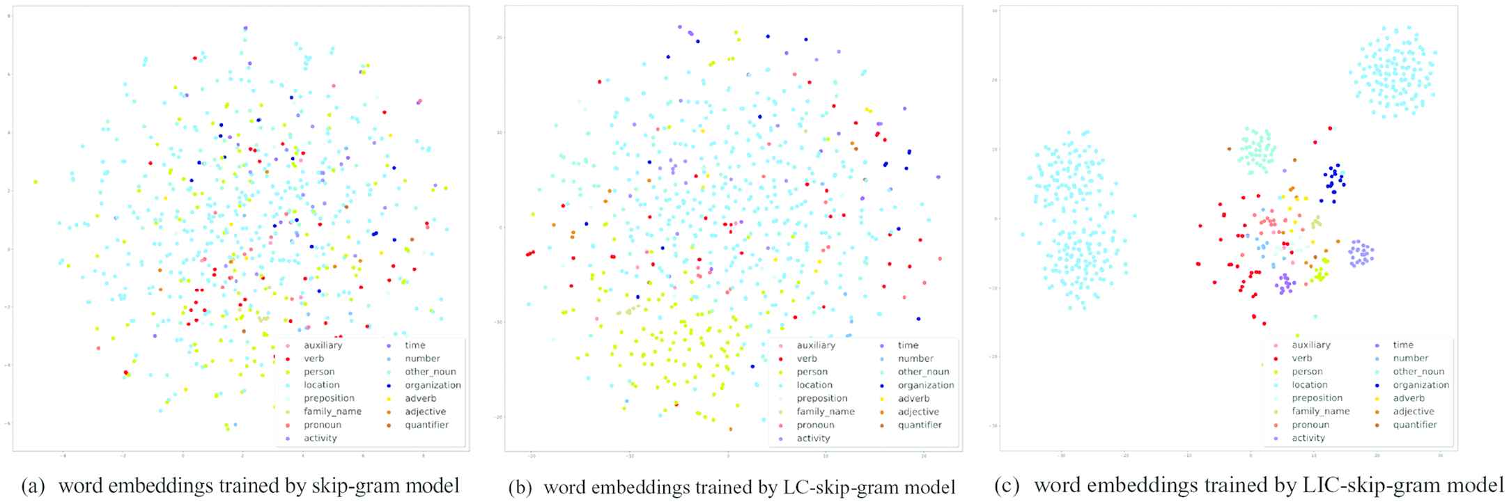 Table 3 shows the five nearest candidates of words from word embeddings trained by three different models, namely skip-gram, LC-skip-gram and LIC-skip-gram model, where the candidates are sorted in descending order by the cosine similarity and bold words are highly related to the corresponding reference words in terms of the semantic closeness. Figure 9 shows the resulting spatial distribution of two-dimensional t-SNE [34] word embeddings trained by these three models, where the legends are consistent with the general category labels in Section 4.2.