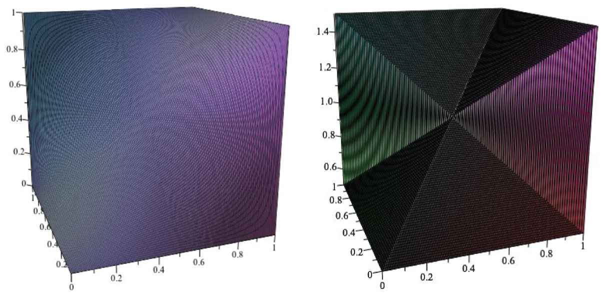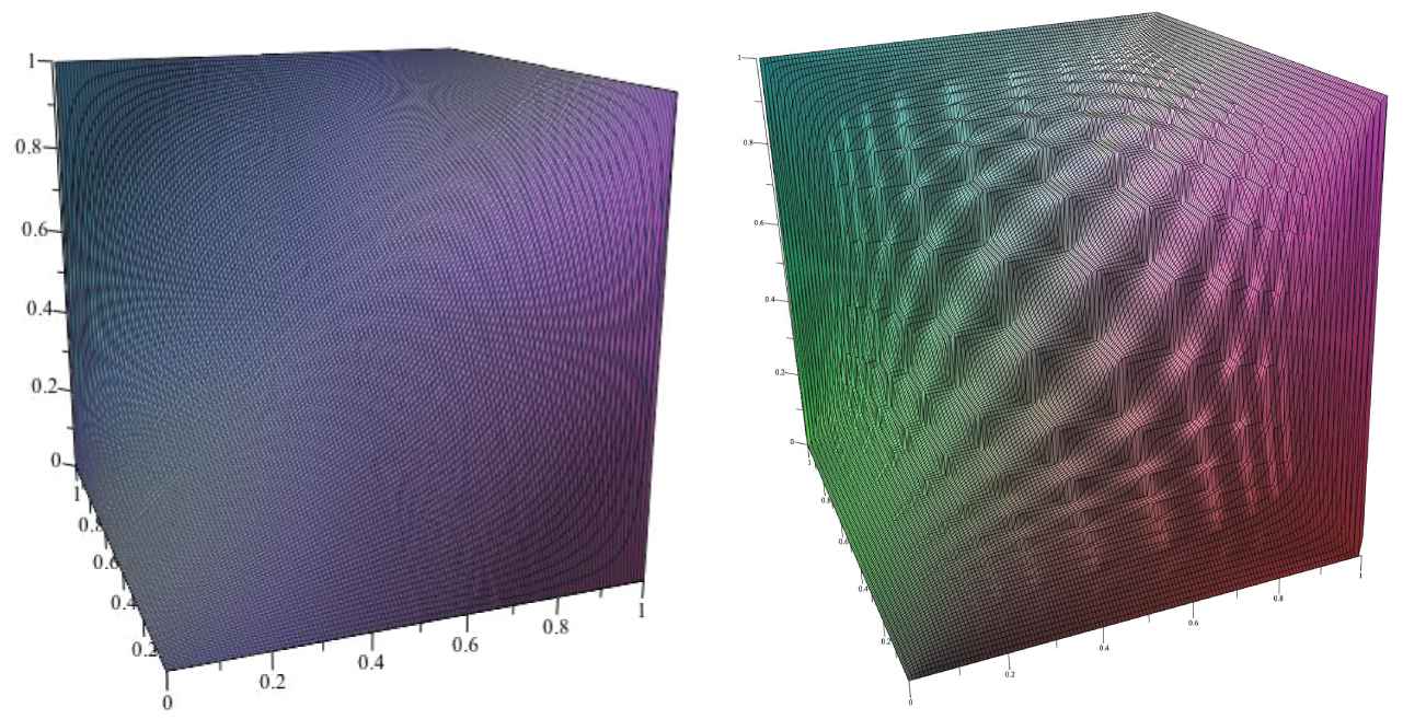 Visualization: the graph of the only linearly ordered abelian group over ]0; 1[ (left) and the graph of the only odd Sugihara monoid over ]0; 1[ (right).